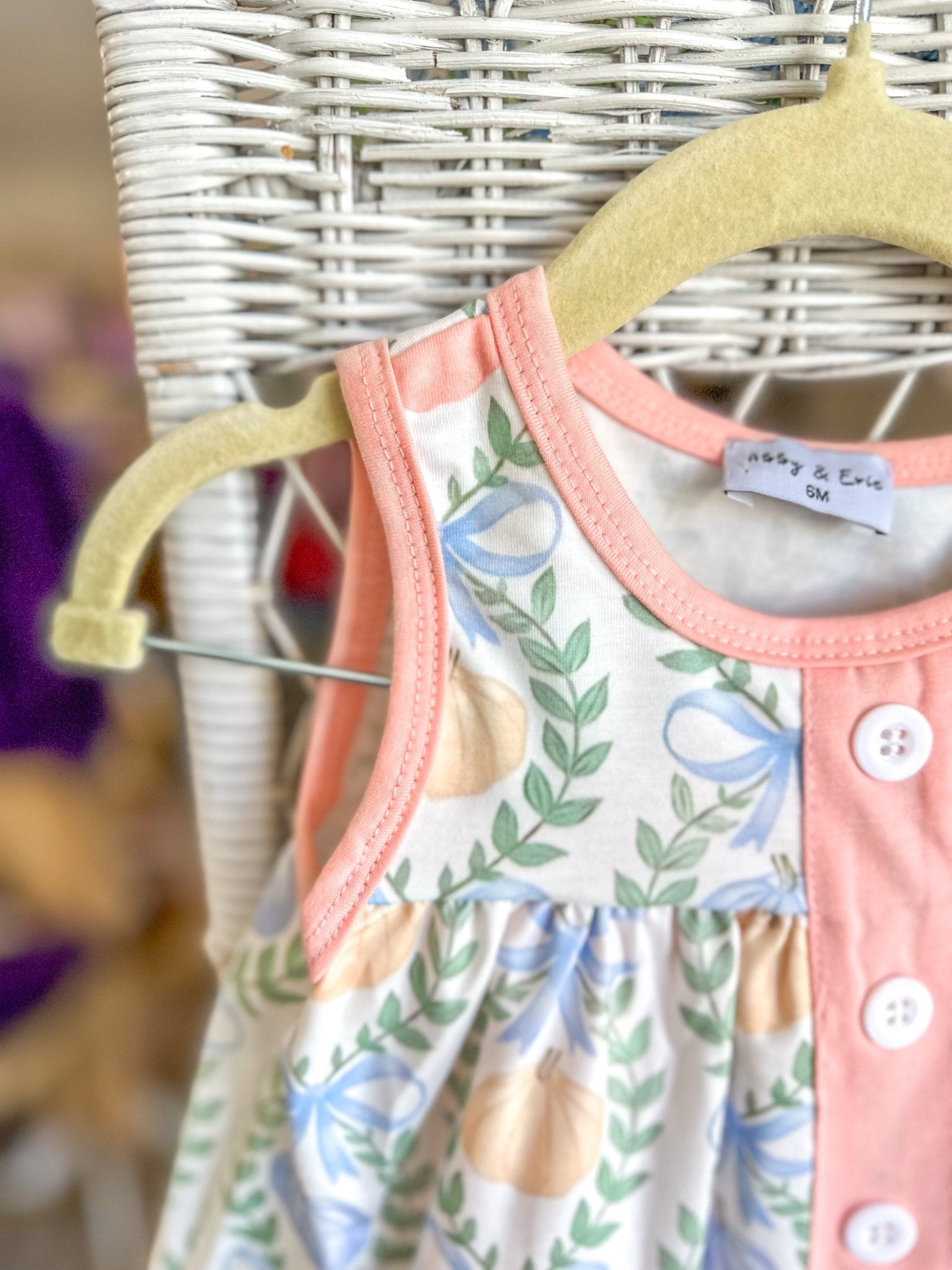 - Playful pumpkin + greenery print with soft pink accents