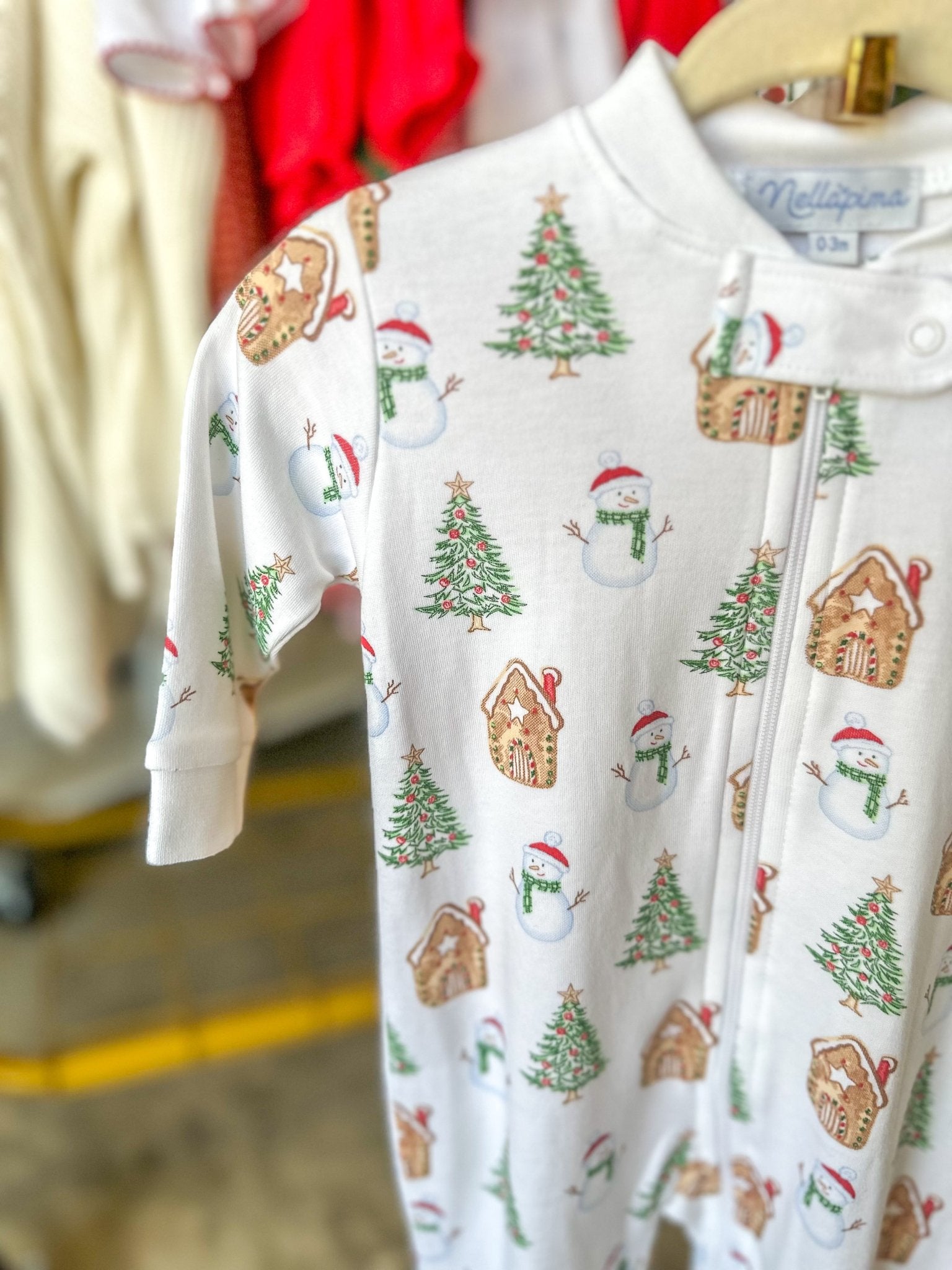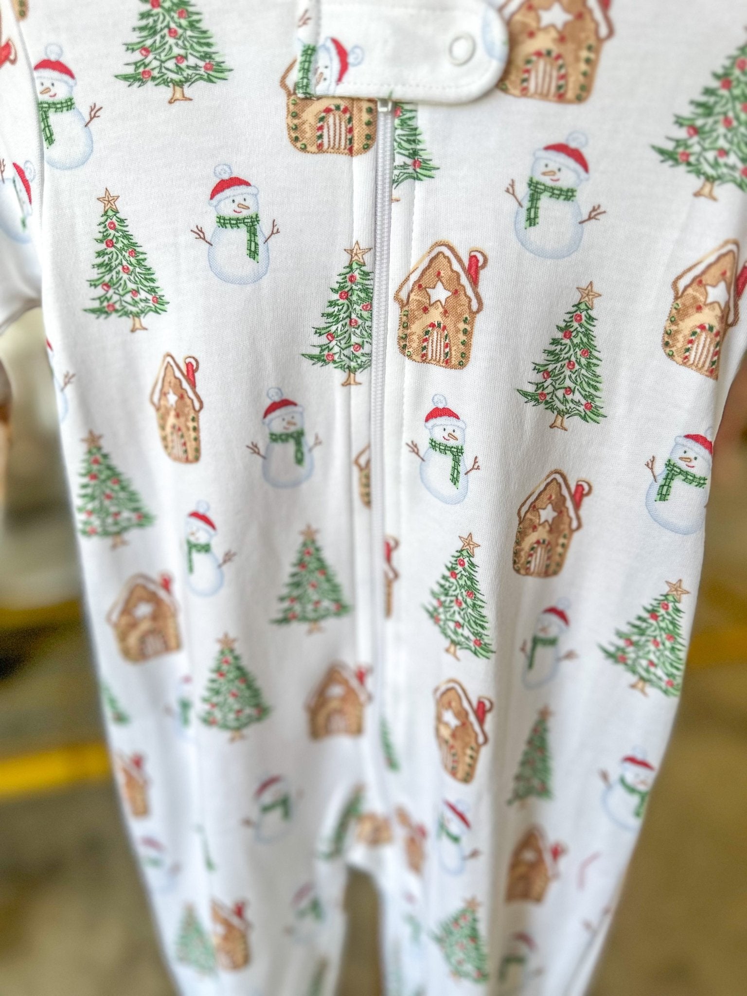 Christmas print with gingerbread houses, trees, and candy canes — perfect for cozy mornings and festive nights. Made from ultra-soft cotton for your little one’s comfort and easy movement.