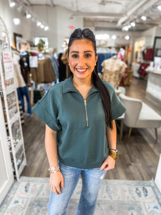 DOORBUSTER: Hunter Green Polish & Poise Scuba Half Zip Short Sleeve Shorts Sets