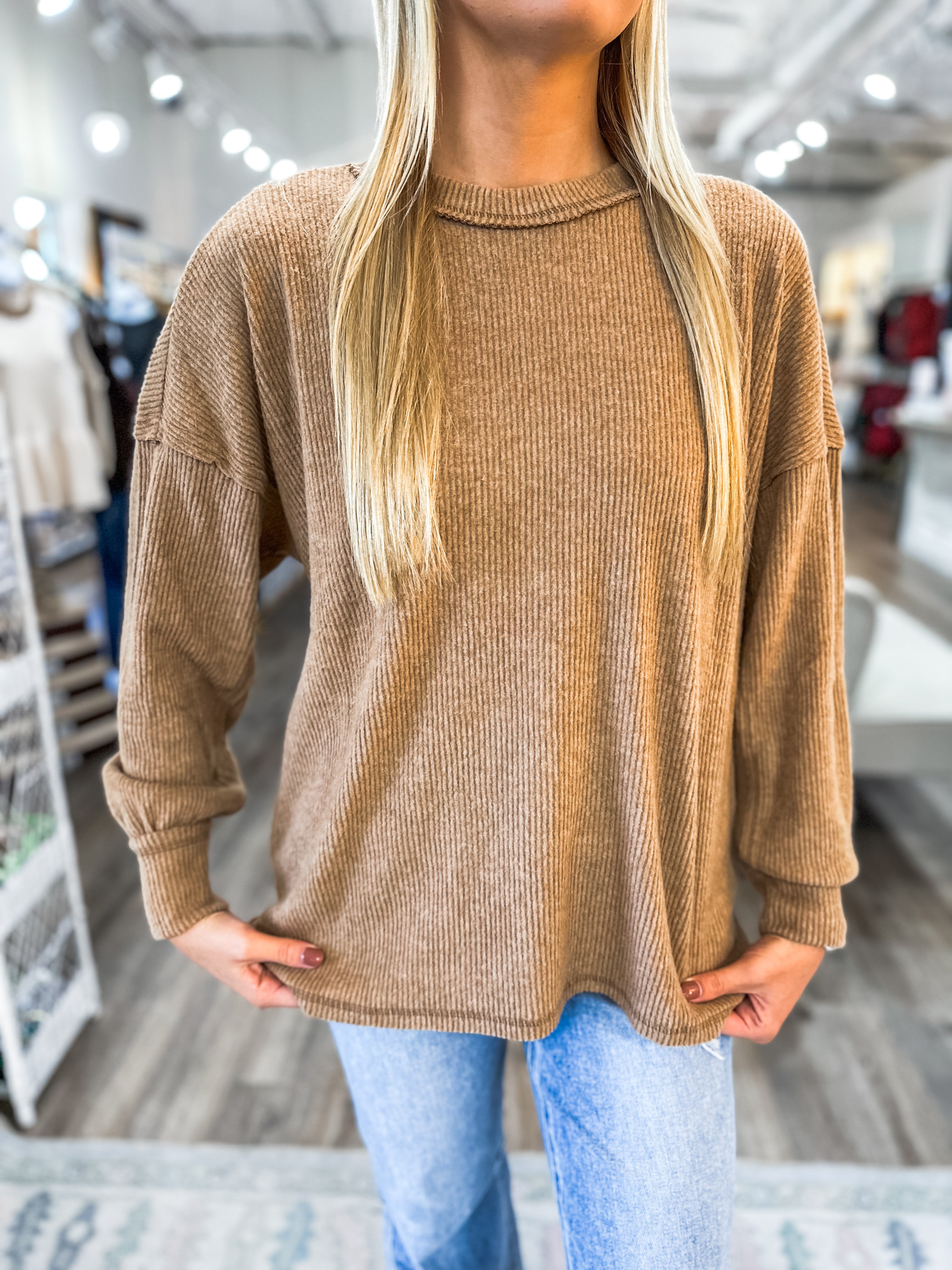 DOORBUSTER: Deep Camel Brushed Ribbed Drop Shoulder Long Sleeve Top