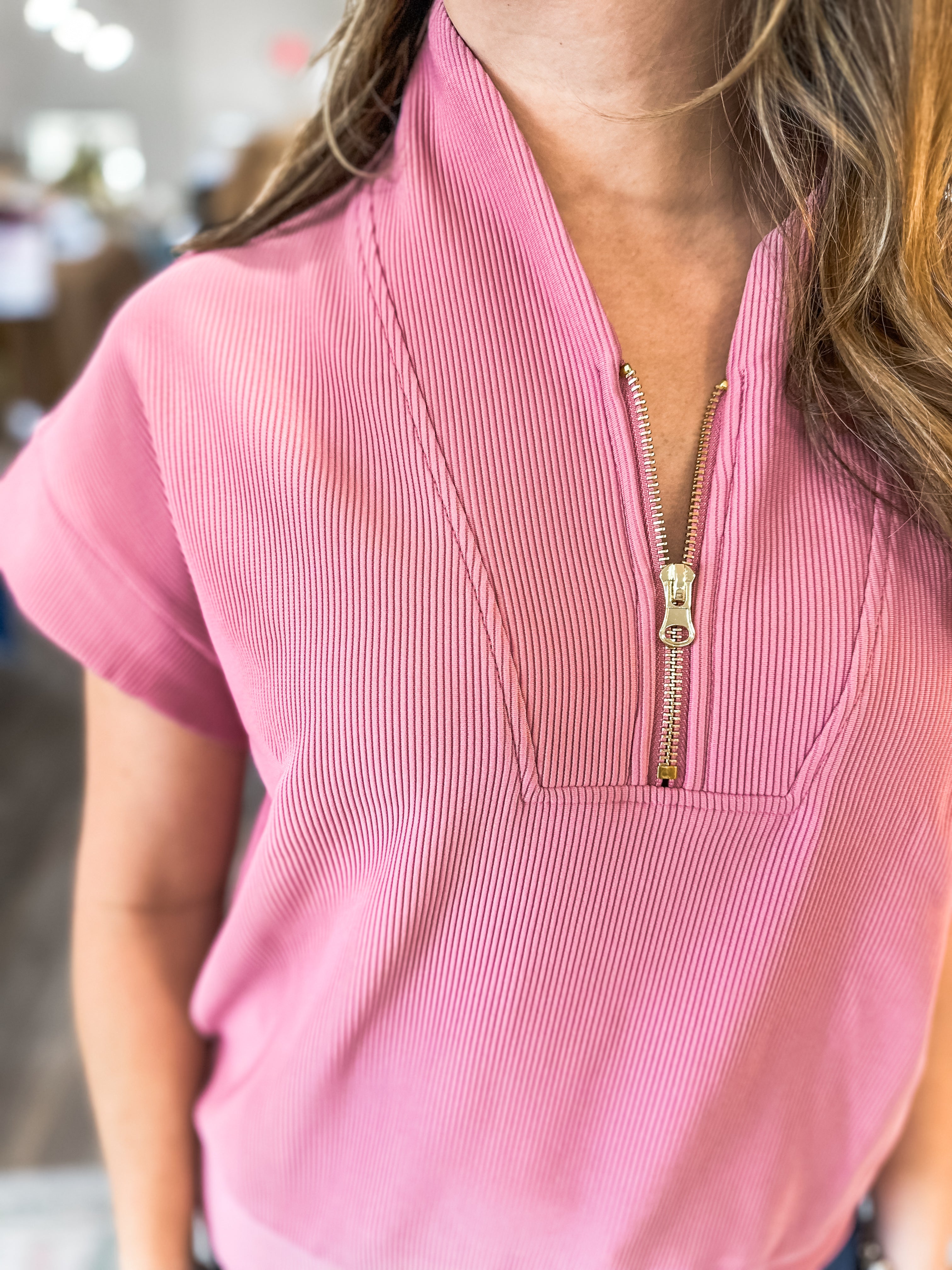 DOORBUSTER: Light Rose Elevate Me Ribbed High Neck Half Zip Top