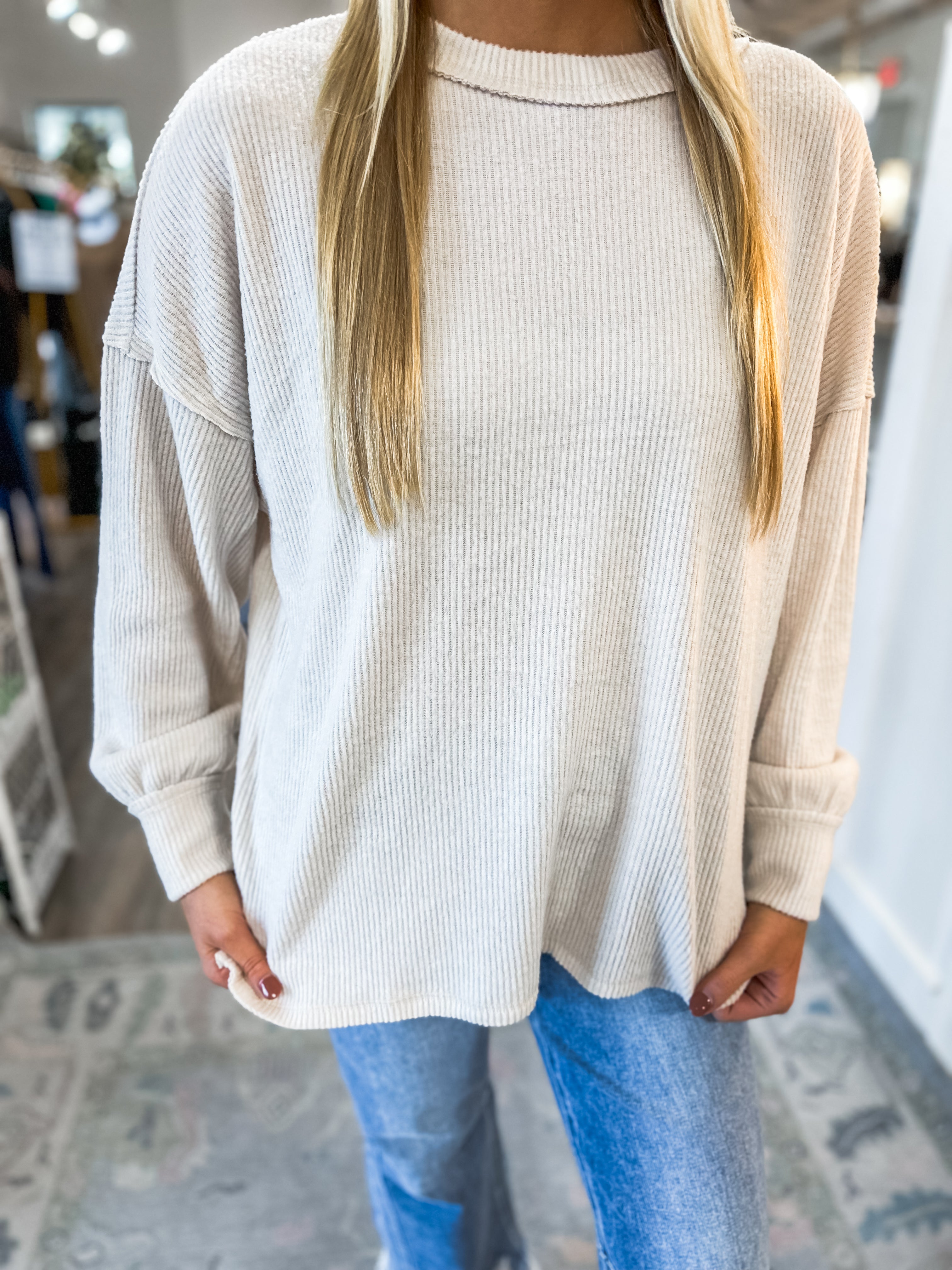 This ribbed drop-shoulder top is the definition of cozy, effortless style. Made with an ultra-soft ribbed knit, it gives you that lived-in comfort while still looking clean and elevated. The drop-shoulder fit creates a relaxed, drapey silhouette, and the subtle rib texture adds dimension without feeling heavy. Finished with a simple crew neckline and easy length for front-tucking, it’s one of those tops you’ll reach for again and again.