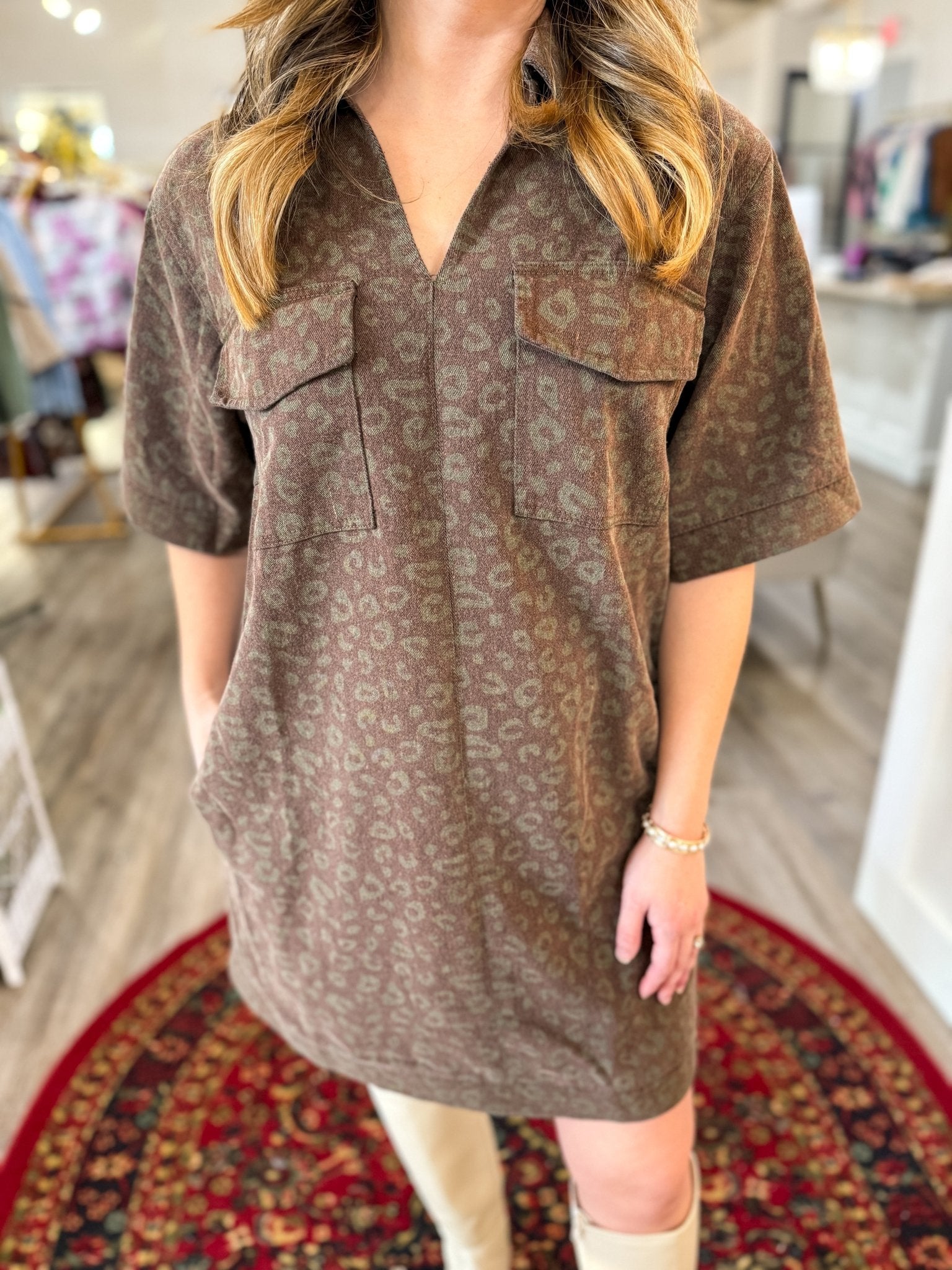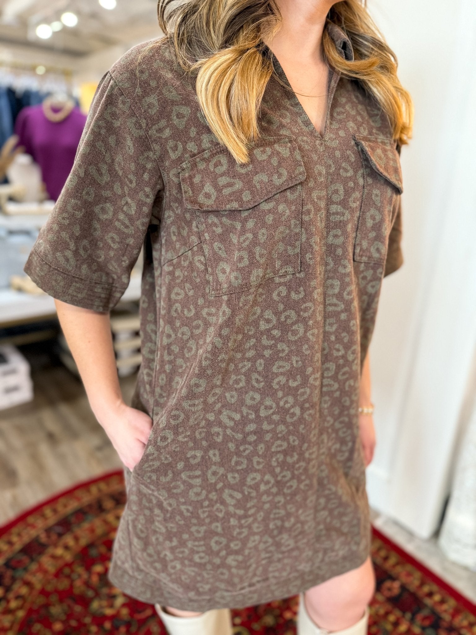 A cute + effortless throw-on-and-go dress for everything from casual workdays to weekend outings! This mini dress features a subtle tone-on-tone leopard print that keeps things fun while still feeling neutral and wearable. Pair with boots, sneakers, or your favorite jacket — it’s one of those styles you’ll reach for over and over.