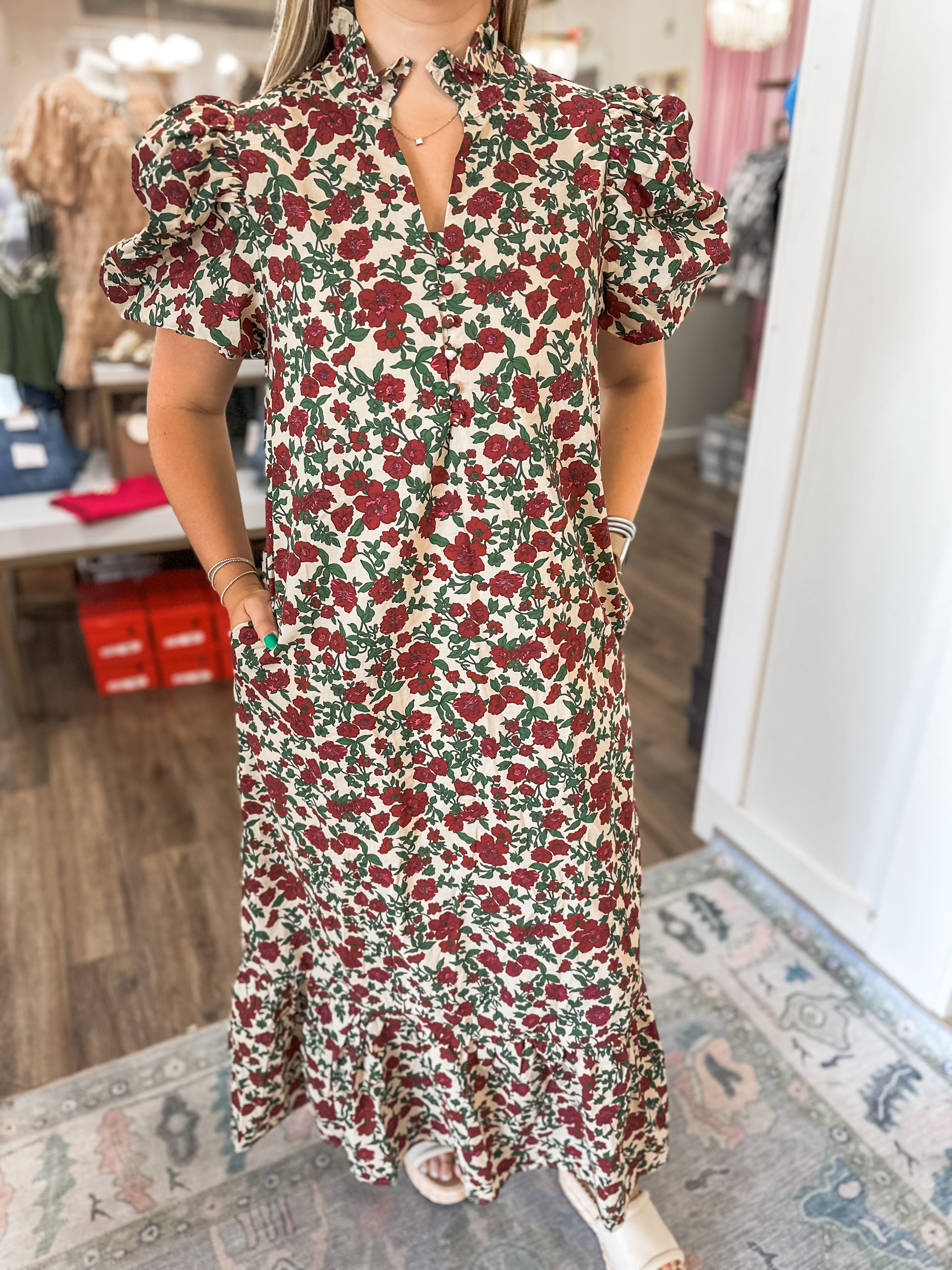 Say hello to timeless charm with the Marigold Manor Midi Dress. This floral beauty pairs a vintage-inspired print with a breezy, comfortable fit, making it a go-to for brunch dates, garden parties, or simply feeling pretty on an ordinary day.