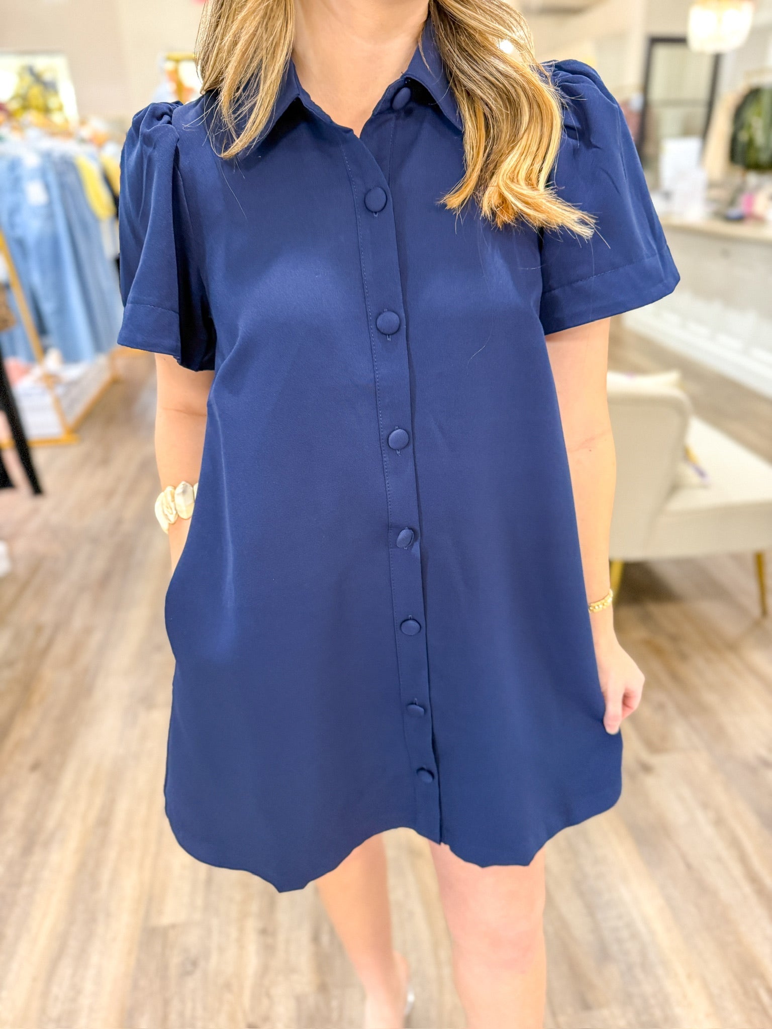 The Navy Charm Mini Dress is your new wardrobe hero. Featuring a collared neckline and a functional button-down front, this dress blends a professional feel with an easy, relaxed silhouette. Made from a lightweight woven fabric, it’s the perfect transition piece—style it with sneakers for errands or wedges for a night out.