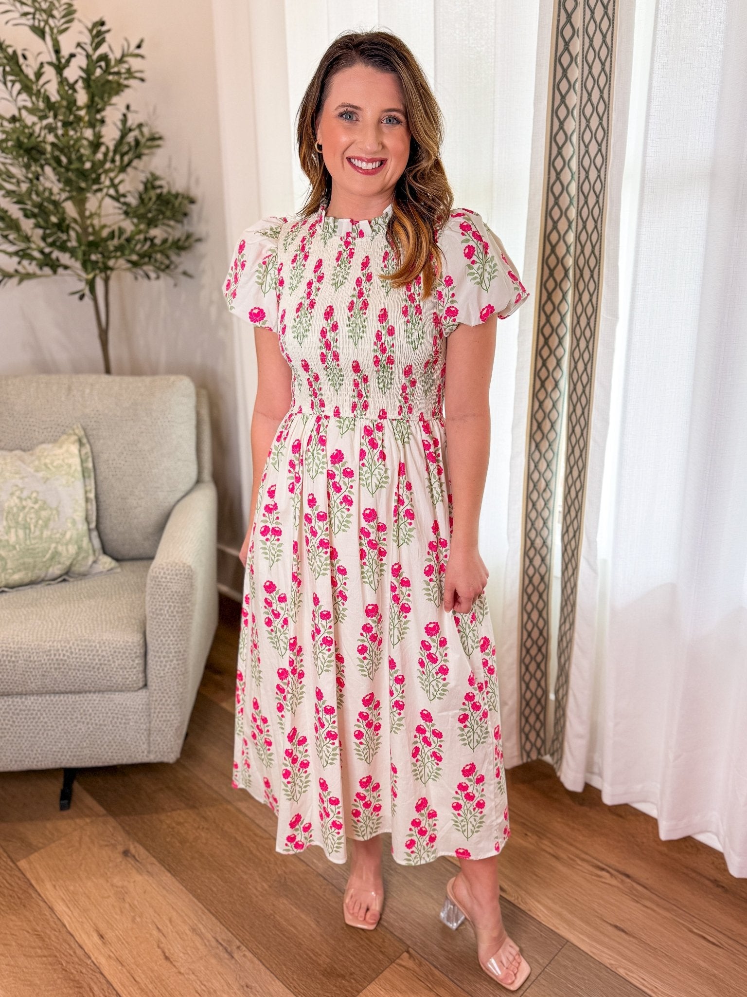 Design: Smocked bodice midi dress with puff sleeves, flowy skirt, and allover floral print