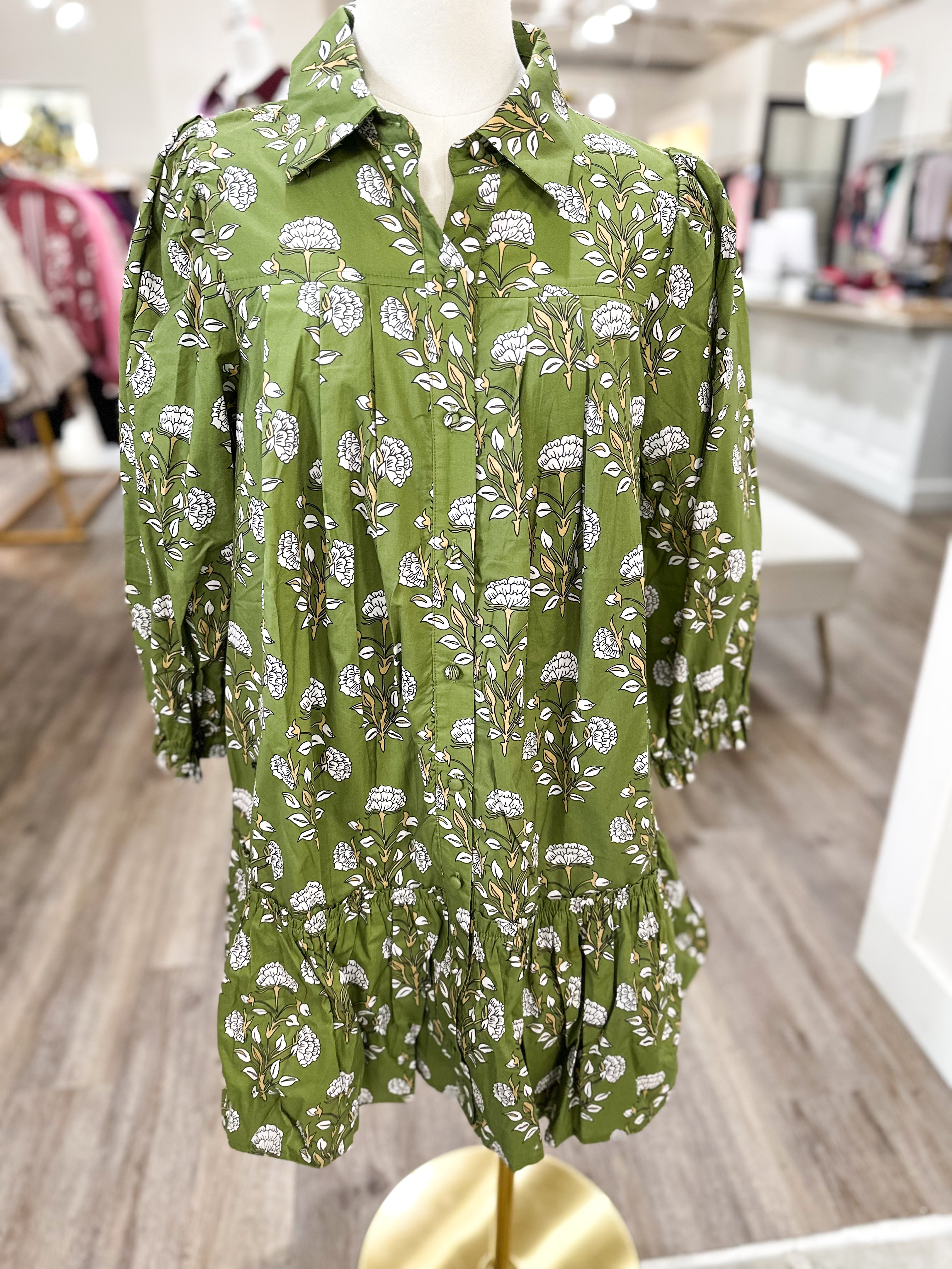 Fresh, feminine, and effortlessly pretty, this mini dress features a soft fern-green base with a delicate floral blossom print that feels perfect for transitioning seasons. Easy to dress up or down, it’s a go-to piece for brunch dates, casual gatherings, or everyday wear.