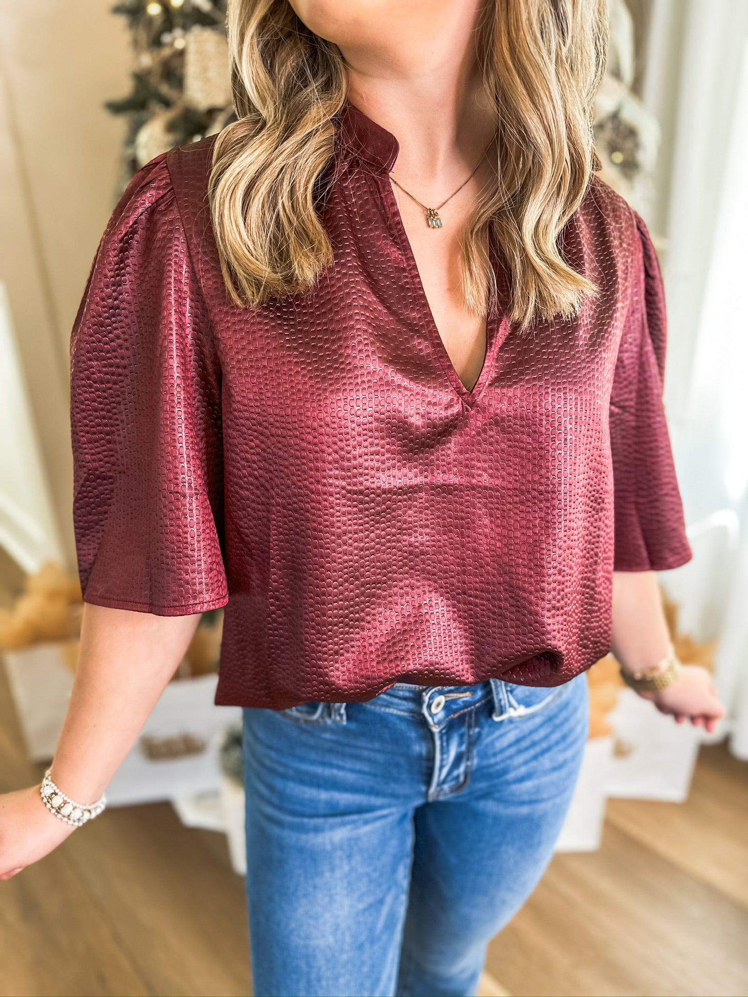 The Love Story Top in burgundy is the perfect blend of timeless charm and everyday ease. With its silky-smooth texture, gathered neckline, and subtle keyhole detail, this piece transitions beautifully from office to evening — just add a bold earring or tailored pant.