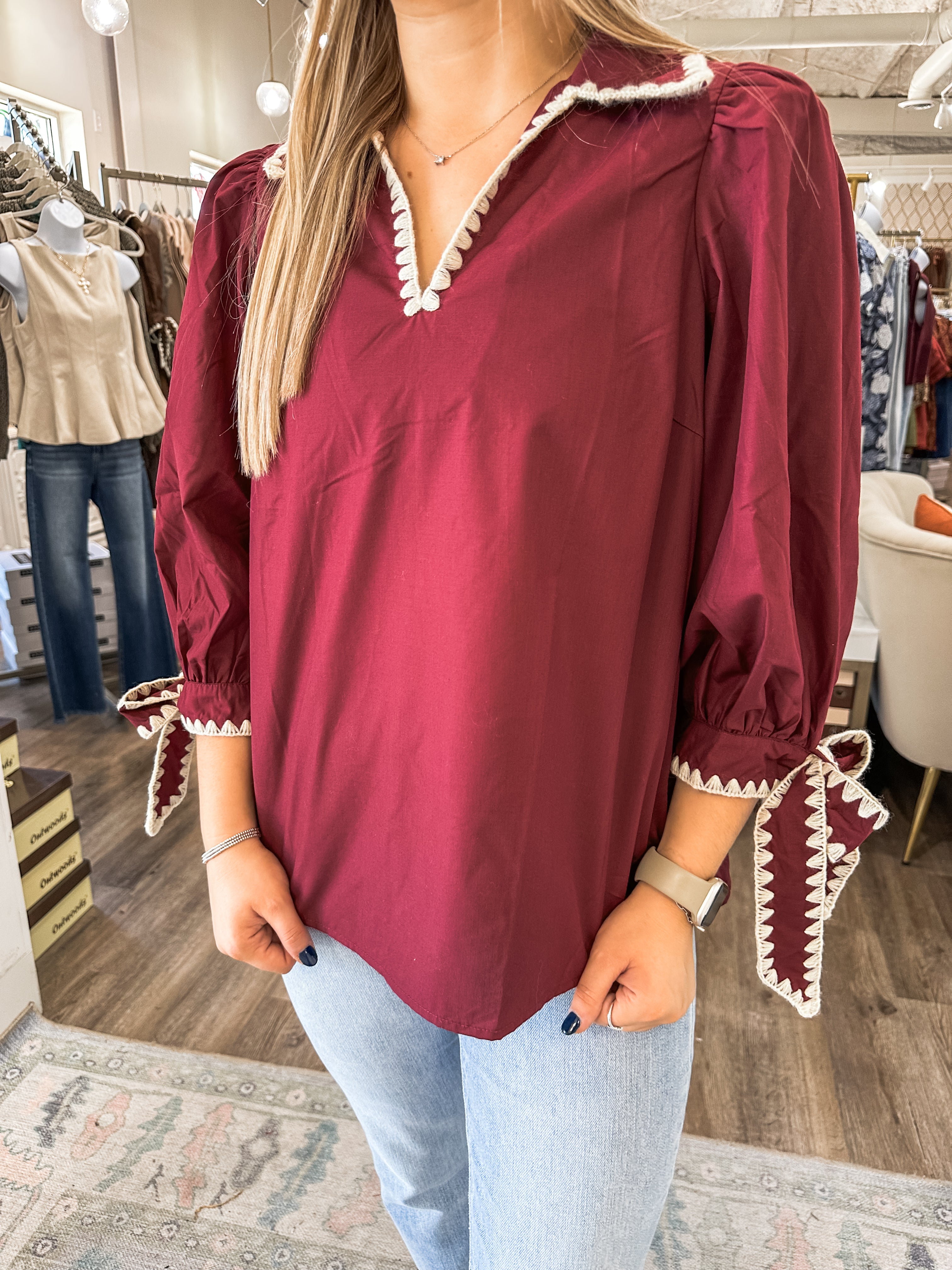 A chic twist on a timeless blouse, this garnet poplin top features darling stitched trim for just the right amount of detail. Perfect for styling with trousers, skirts, or denim when you want a polished yet effortless look.