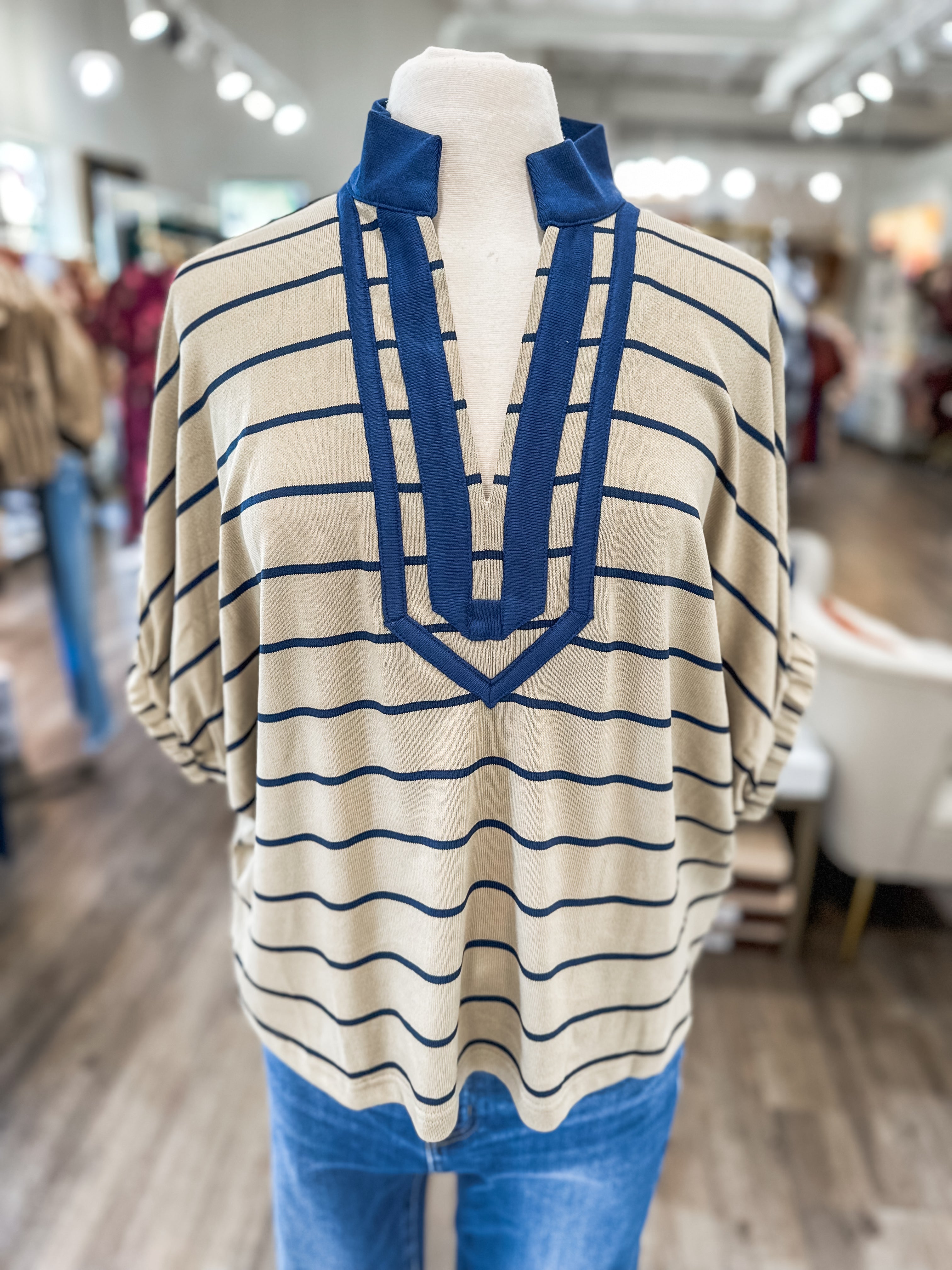 Effortless and brings a touch of coastal charm to your everyday look. The contrast trim and open neckline add polish, while the relaxed fit keeps it easy and comfortable for all-day wear.