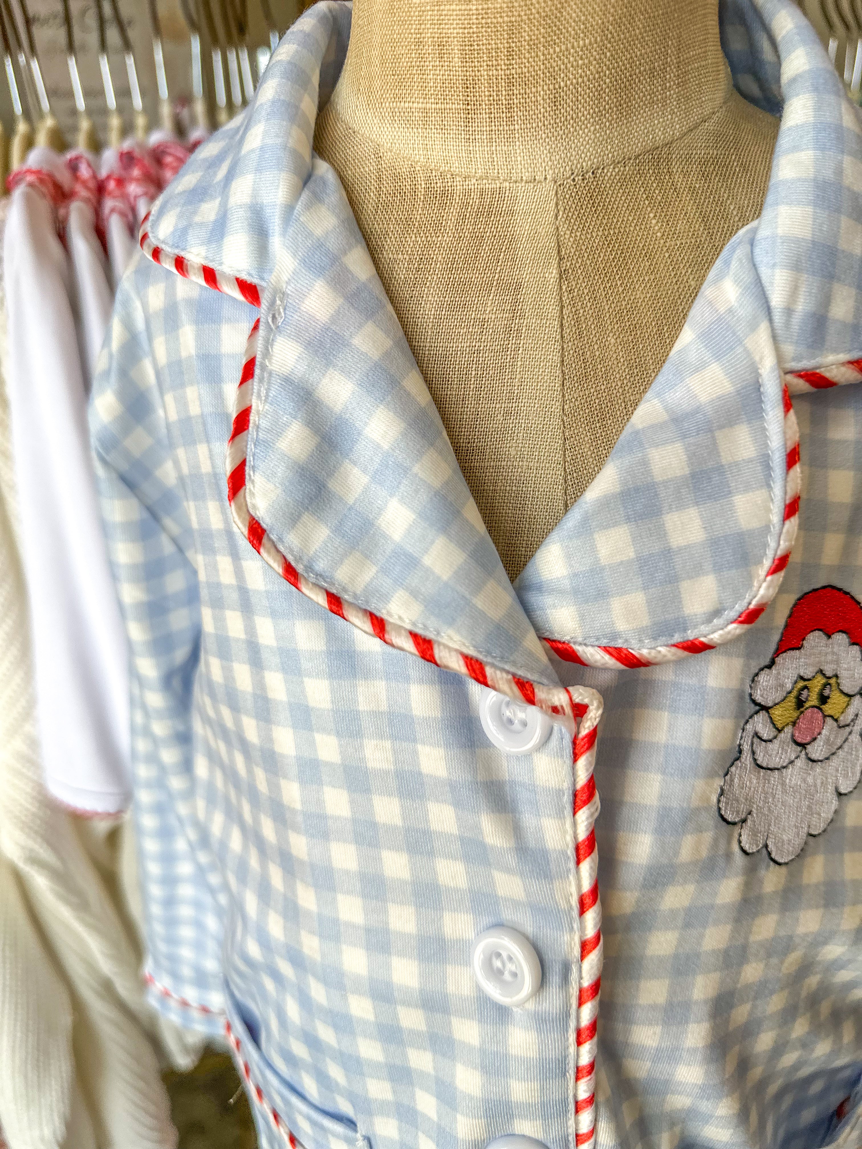 Featuring a soft gingham print trimmed in red piping and embroidered with a cheerful Santa, this cozy two-piece is perfect for festive family photos and holiday lounging.