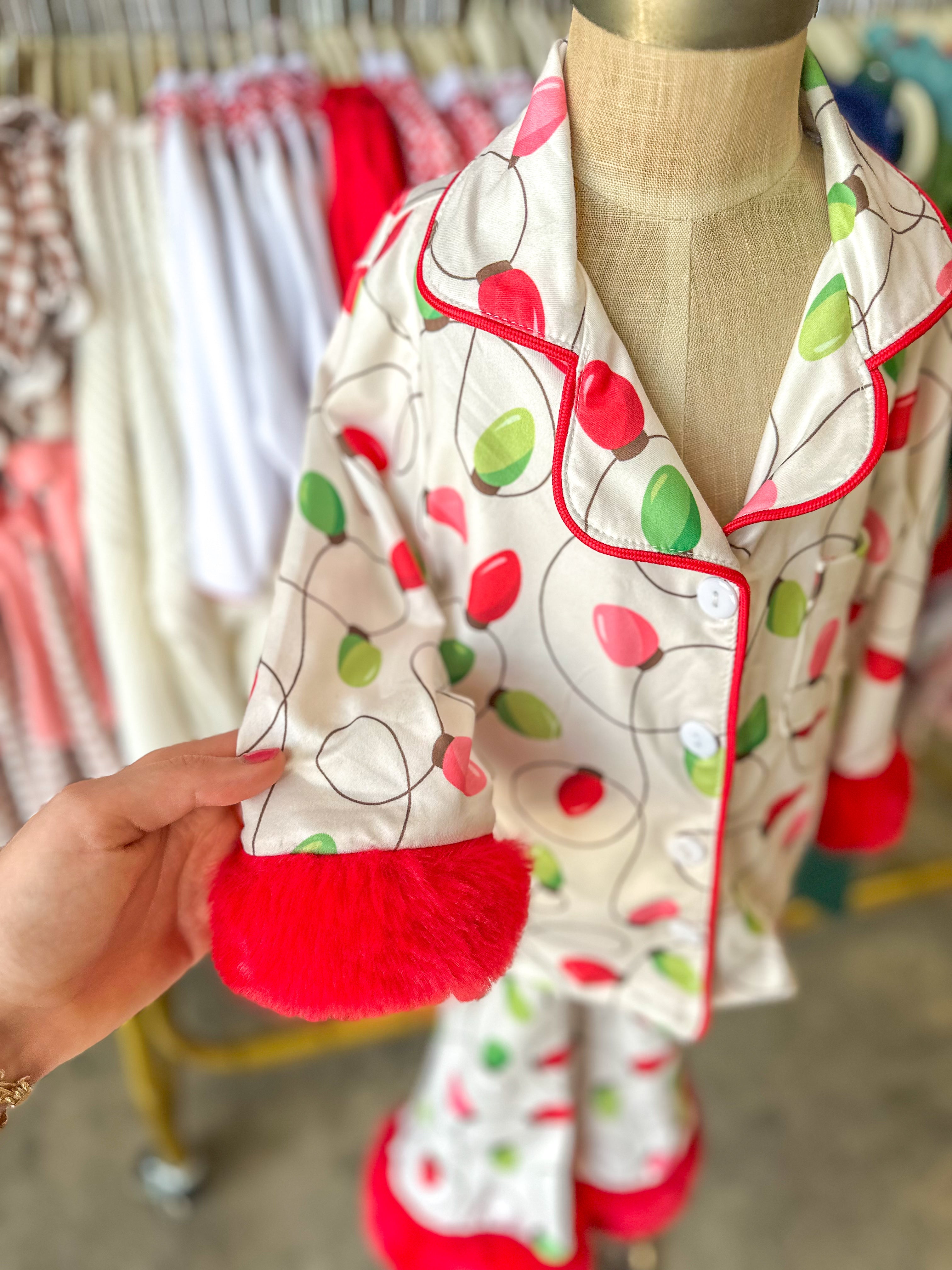 This festive pajama set features a whimsical Christmas lights print trimmed with red piping and fuzzy cuffs for the coziest holiday touch. Perfect for matching sibling sets, movie nights, and those magical Christmas morning photos!