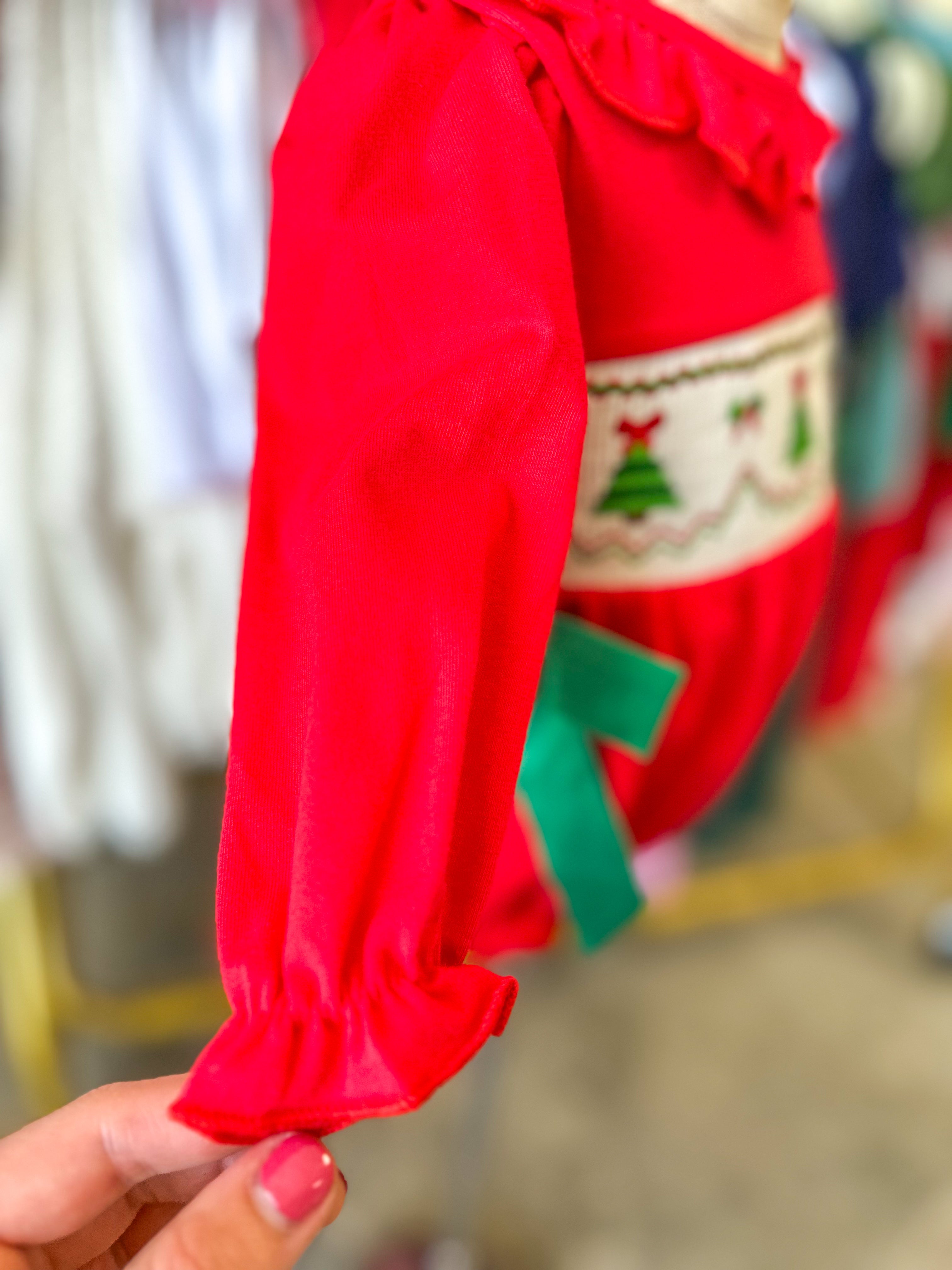 Christmas trees across the chest, a ruffled neckline, and a bold green bow at the waist — it’s the perfect mix of festive and classic. Made for Christmas photos, parties, and holiday memories that last a lifetime.