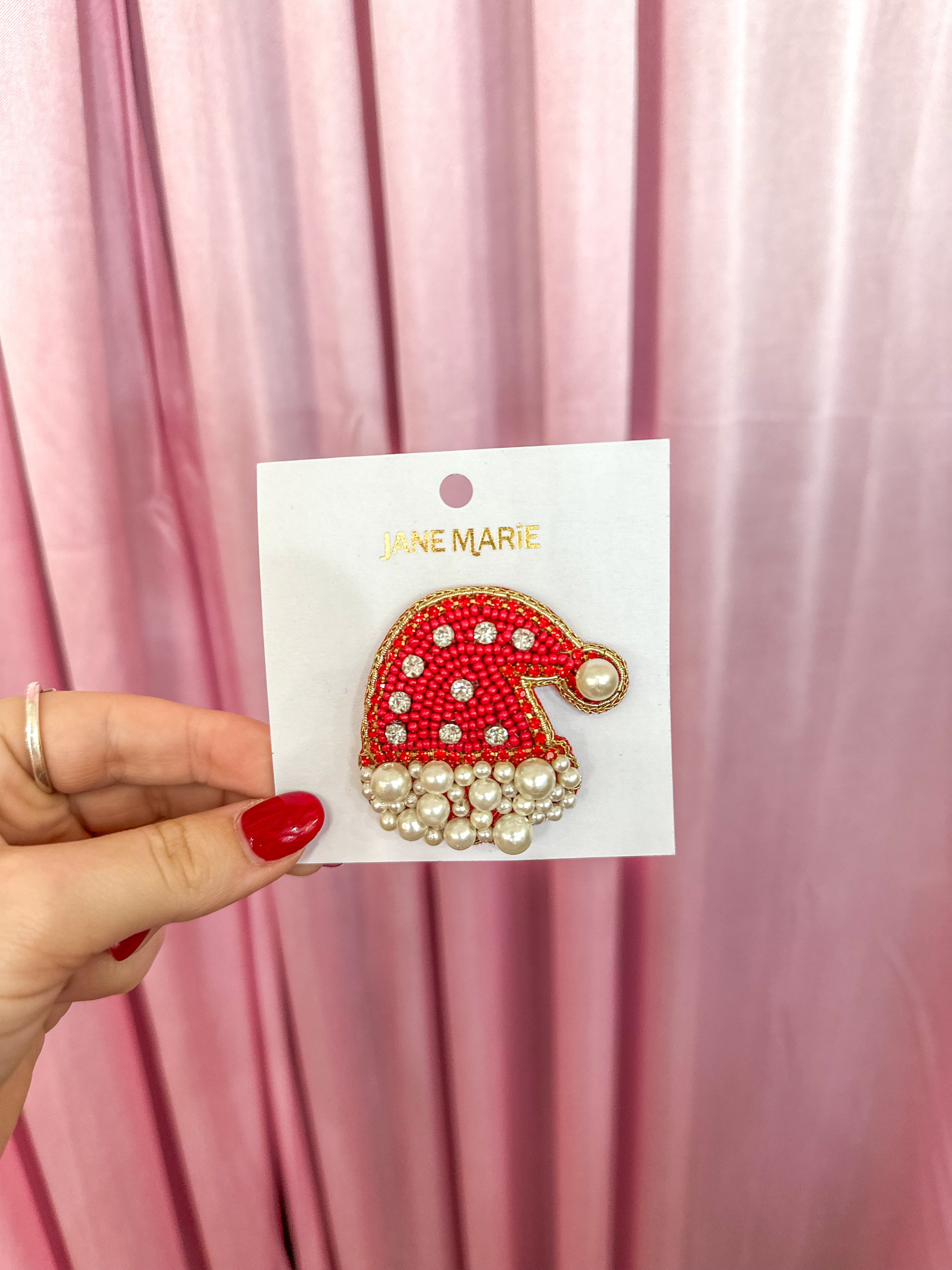 Add a jolly touch to your holiday outfits with this charming Santa hat brooch, detailed in red beads and finished with pearl accents. A festive little sparkle for your sweaters, coats, or scarves.