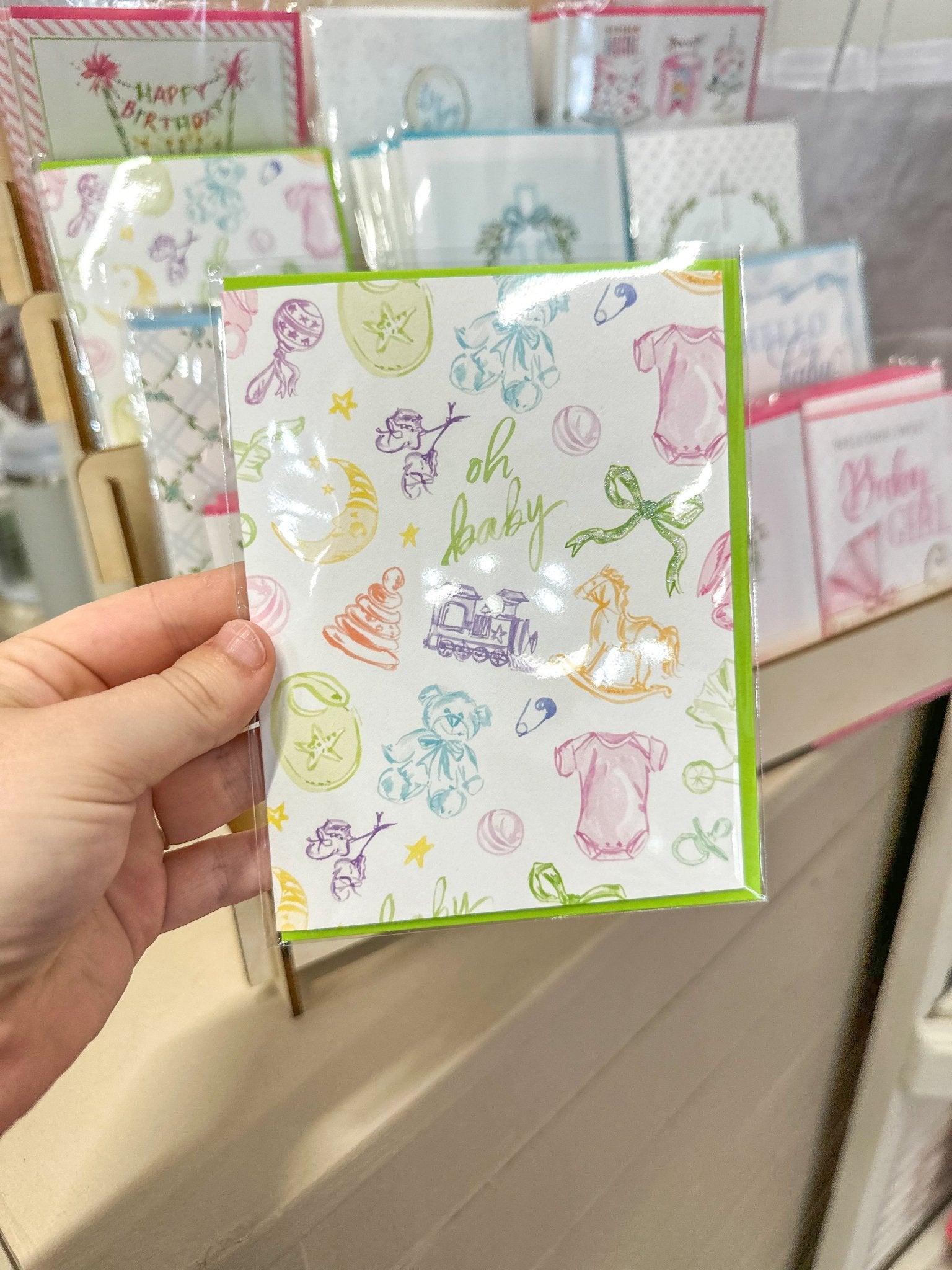 Celebrate new arrivals with the charming elegance of the Hand Painted Oh Baby Multicolor Toile Greeting Card. Featuring a delicate multicolor toile pattern with hand-painted accents, this card adds a timeless and artistic touch to your heartfelt message.