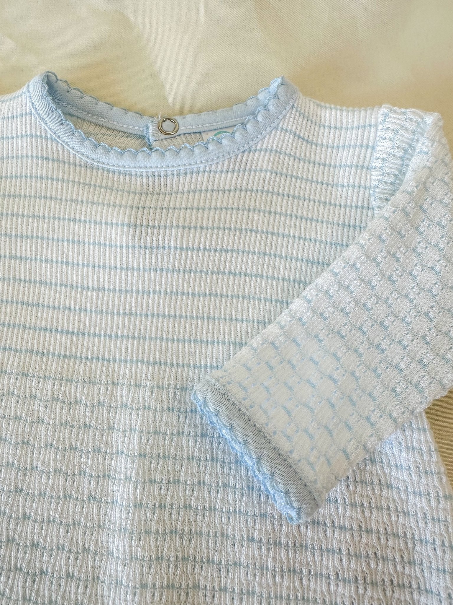 Soft, classic, and oh-so-sweet — the Paty Pal Blue with Blue Trim Pinstripe Romper is a timeless piece for your little one’s wardrobe. Made with Paty’s signature lightweight knit, this romper features a subtle pinstripe design with coordinating blue trim, blending comfort with traditional charm.