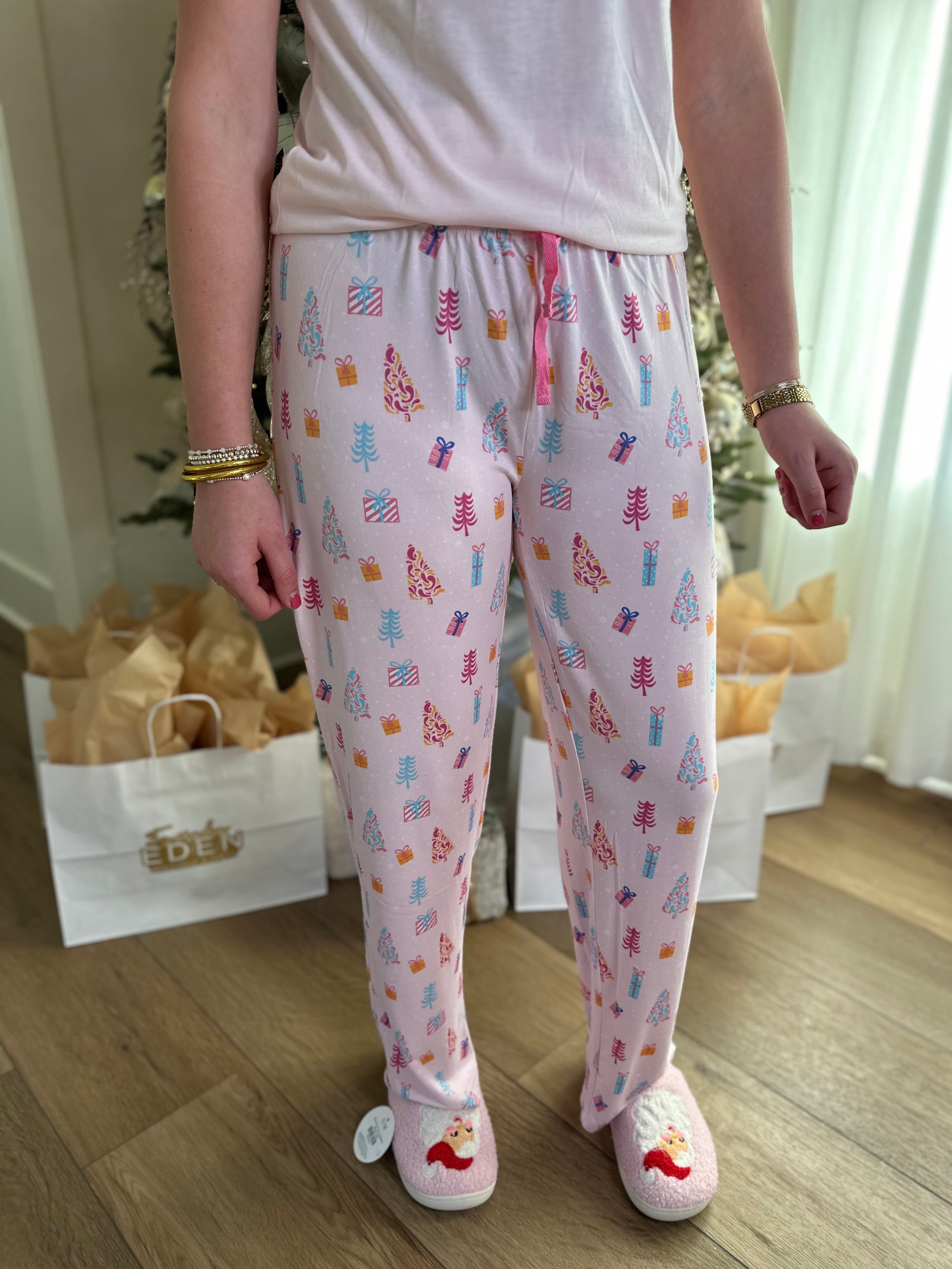 Featuring a playful print of colorful Christmas trees against a soft blush pink background, they’re the perfect mix of comfort and cheer for the holiday season.