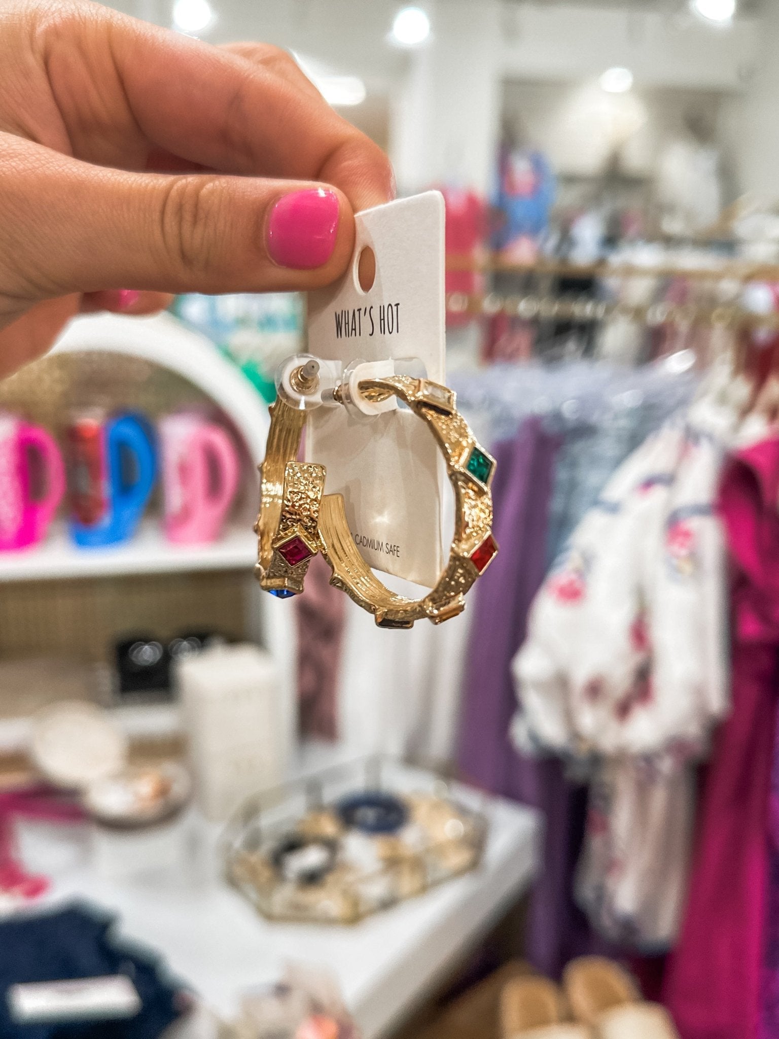 Add a pop of color and texture to your everyday glam 💎✨ The Gold Textured Hoop W/ Multi Color Diamond Crystals brings bold sparkle in a playful 2” hoop design. With a hammered gold finish and faceted rainbow-toned stones, these earrings are a fun statement for everything from vacay dinners to colorful everyday looks.