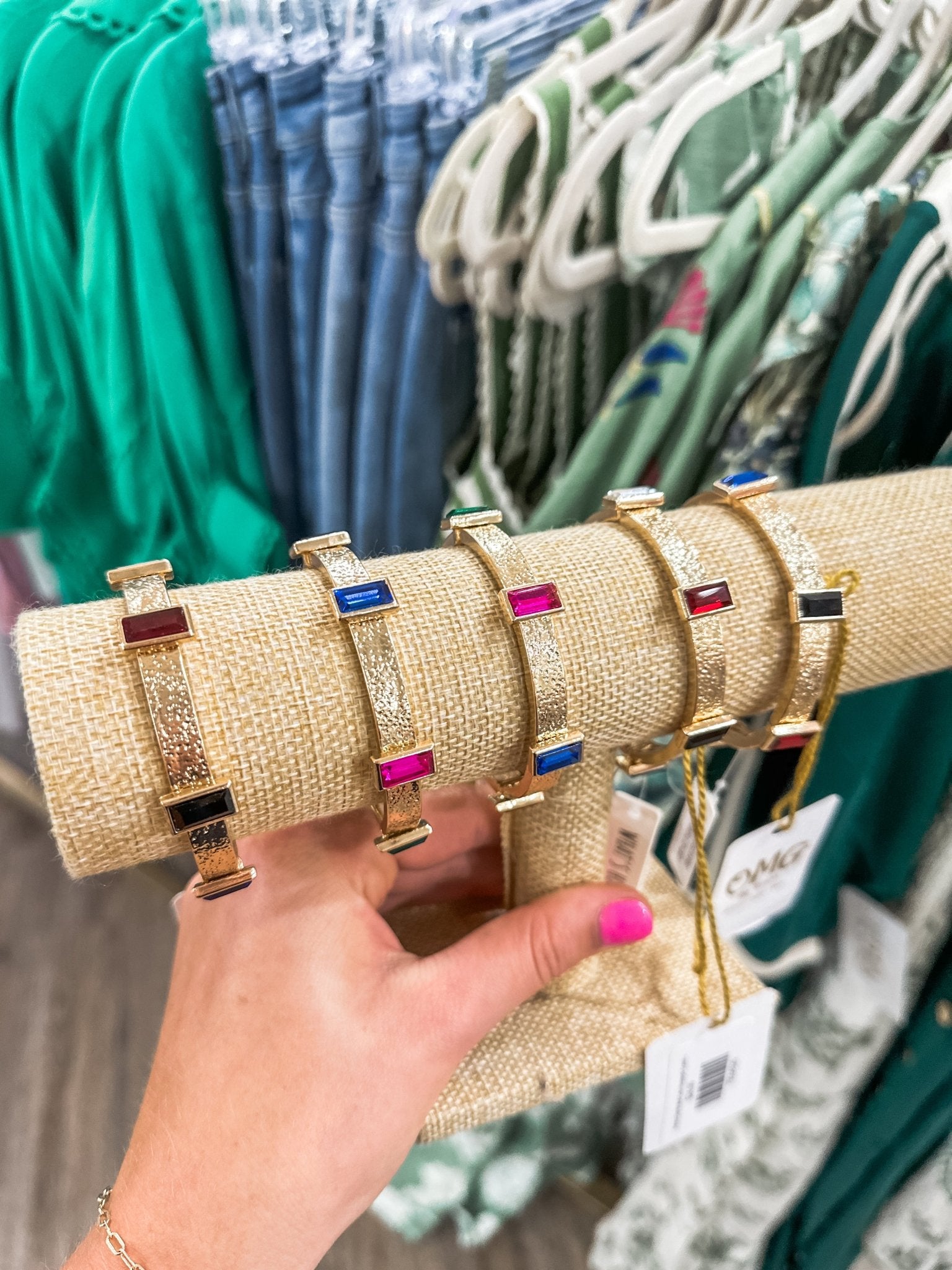 Bold color, effortless sparkle đ The Textured Gold W/ Multi Color Rectangle Crystals Stretch Bracelet features a hammered gold finish and a pop of color with rectangular crystal accents in vivid jewel tones. With a comfortable stretch fit and eye-catching design, itâs perfect for stacking, gifting, or making a solo statement.