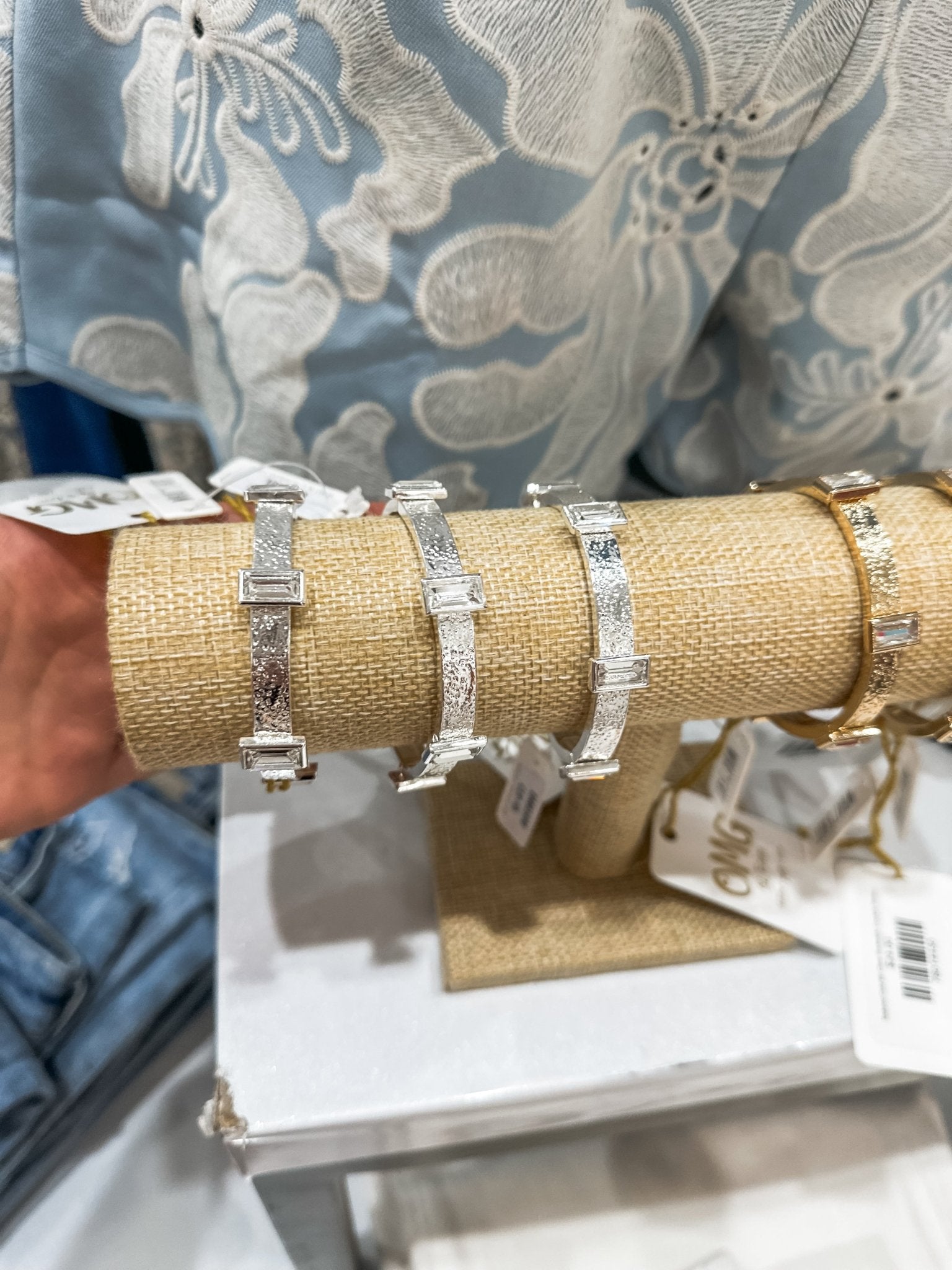 Shine with sophistication in our Textured Silver Stretch Bracelet featuring dazzling clear rectangular crystals. The hammered silver finish adds a modern edge, while the stretch fit makes it effortlessly wearable from day to night. A perfect pop of sparkle for stacking or standing solo!