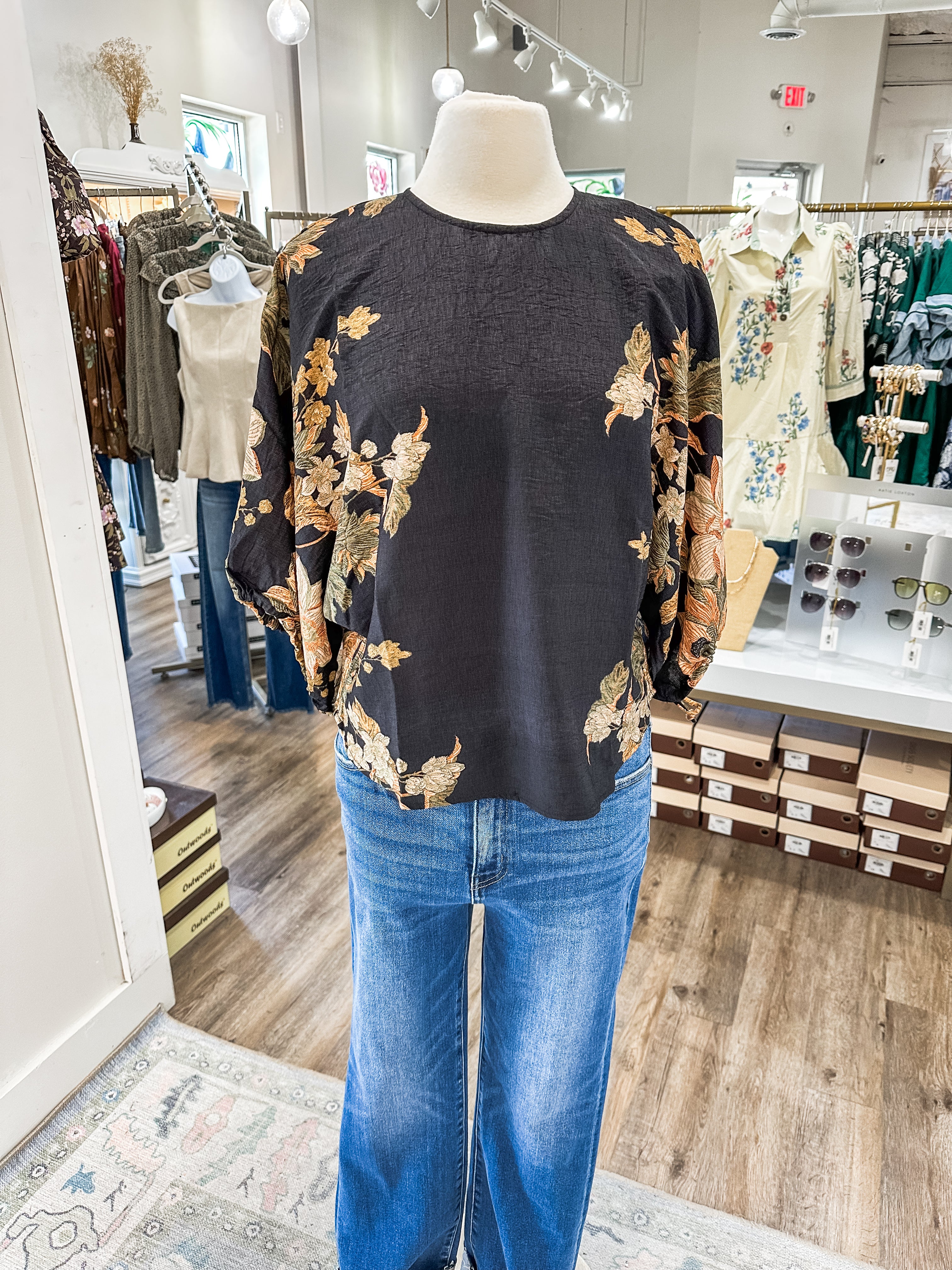 A true showstopper for fall and beyond, features bold embroidered florals in rich autumn hues against a deep black backdrop. The voluminous sleeves and cropped silhouette create an effortlessly elevated look that pairs perfectly with high-waisted denim or tailored trousers.