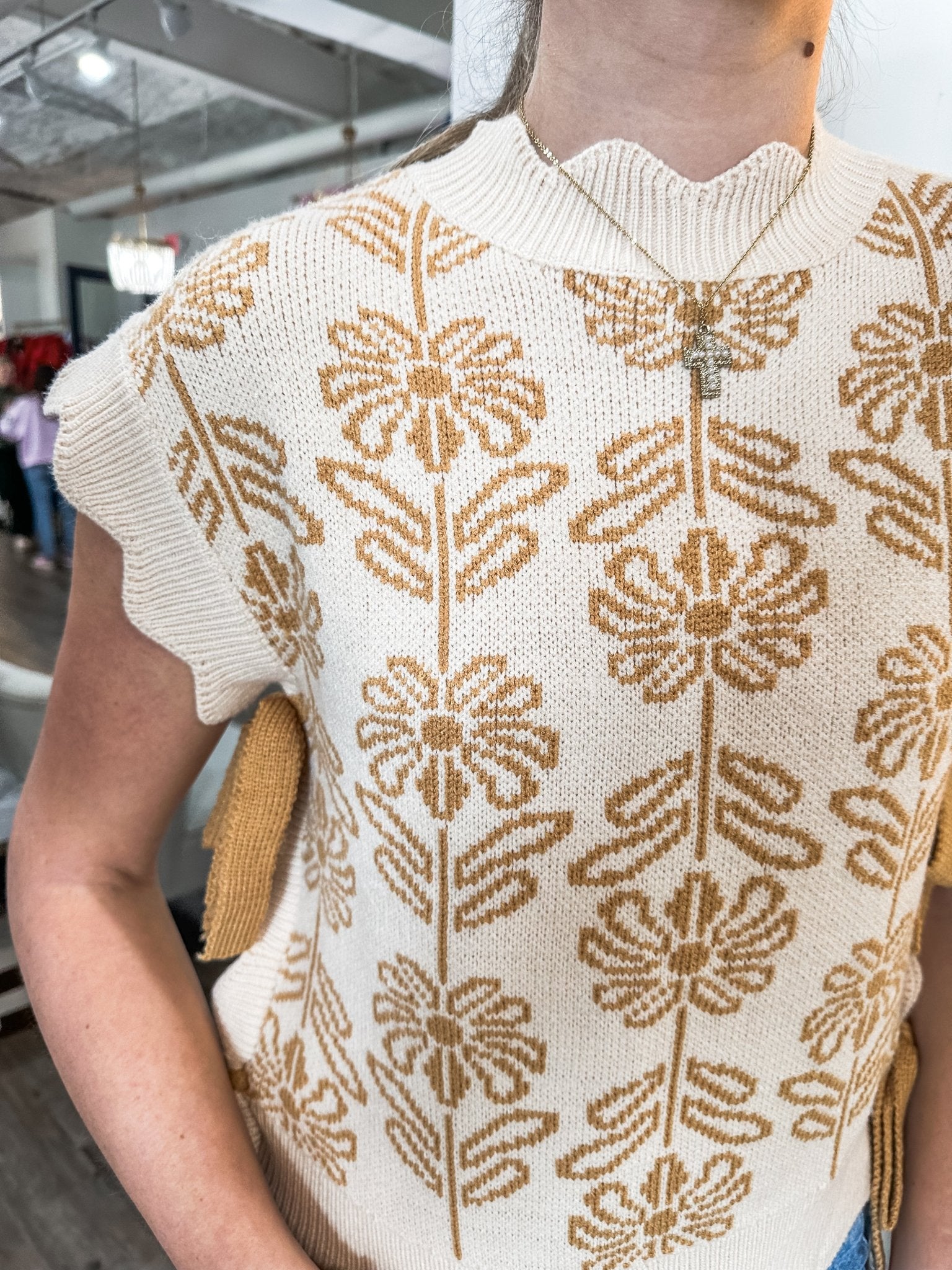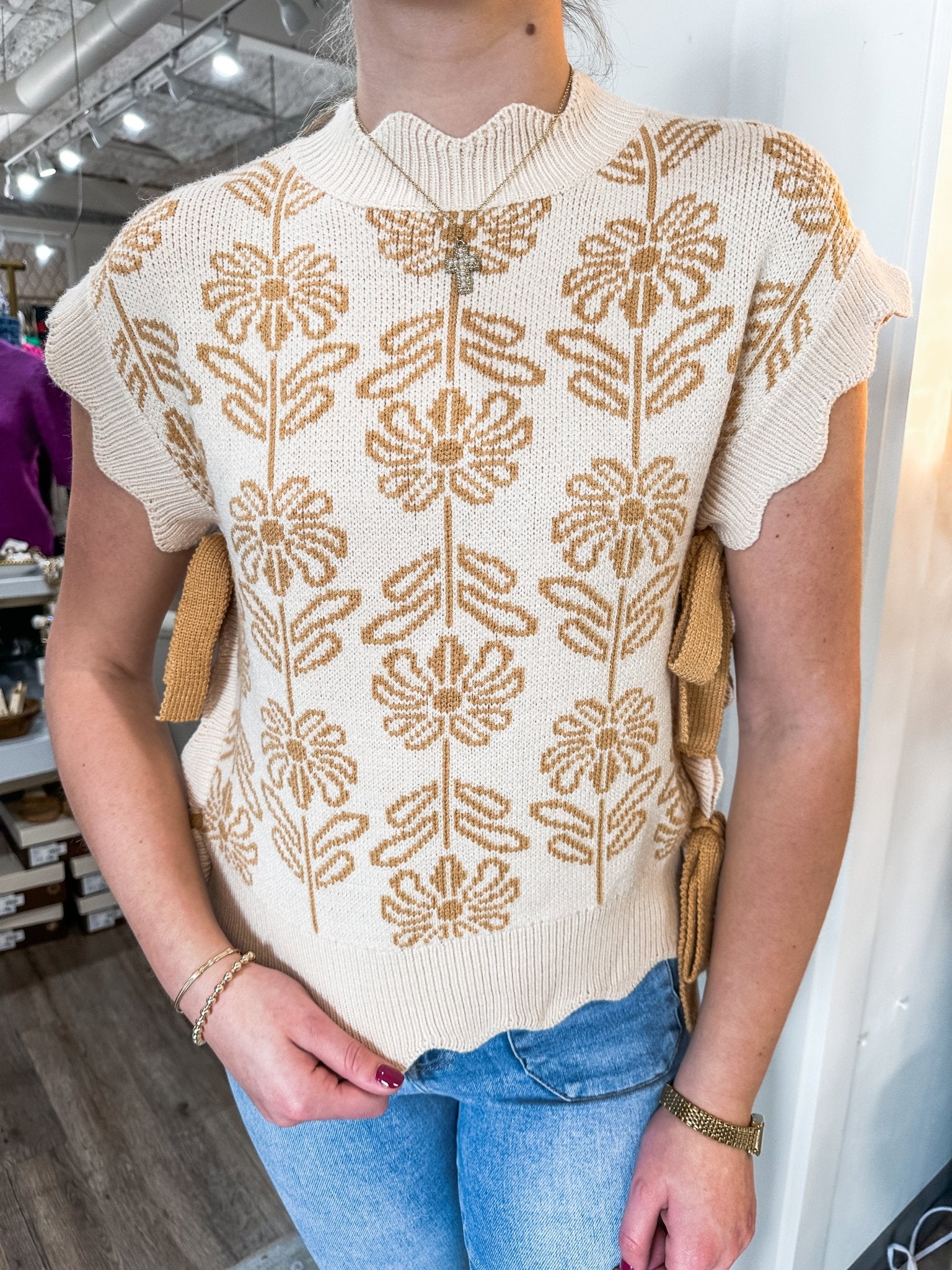 Beige Taupe Look This Way Sleeveless Bow Tie Sweater Scallop Edge — Everyone will be tempted to look your way when wearing this top: the precious bow detail is the highlight! Chelsea is 5’3” Size 0/2 wearing her true size Small. Size Guide: Small 0/4, Medium 6/8, Large 10/12 for a comfortable fit.