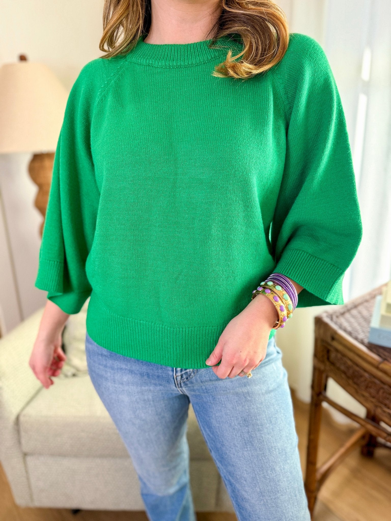 Cozy meets bold in the Green Easy & Chic Quarter Sleeve Sweater. This vibrant knit is the pop of color your wardrobe's been missing. With its relaxed fit and quarter-length sleeves, it transitions effortlessly from chilly mornings to breezy spring afternoons. Pair it with denim or floral prints for a sweet contrast of texture and color.