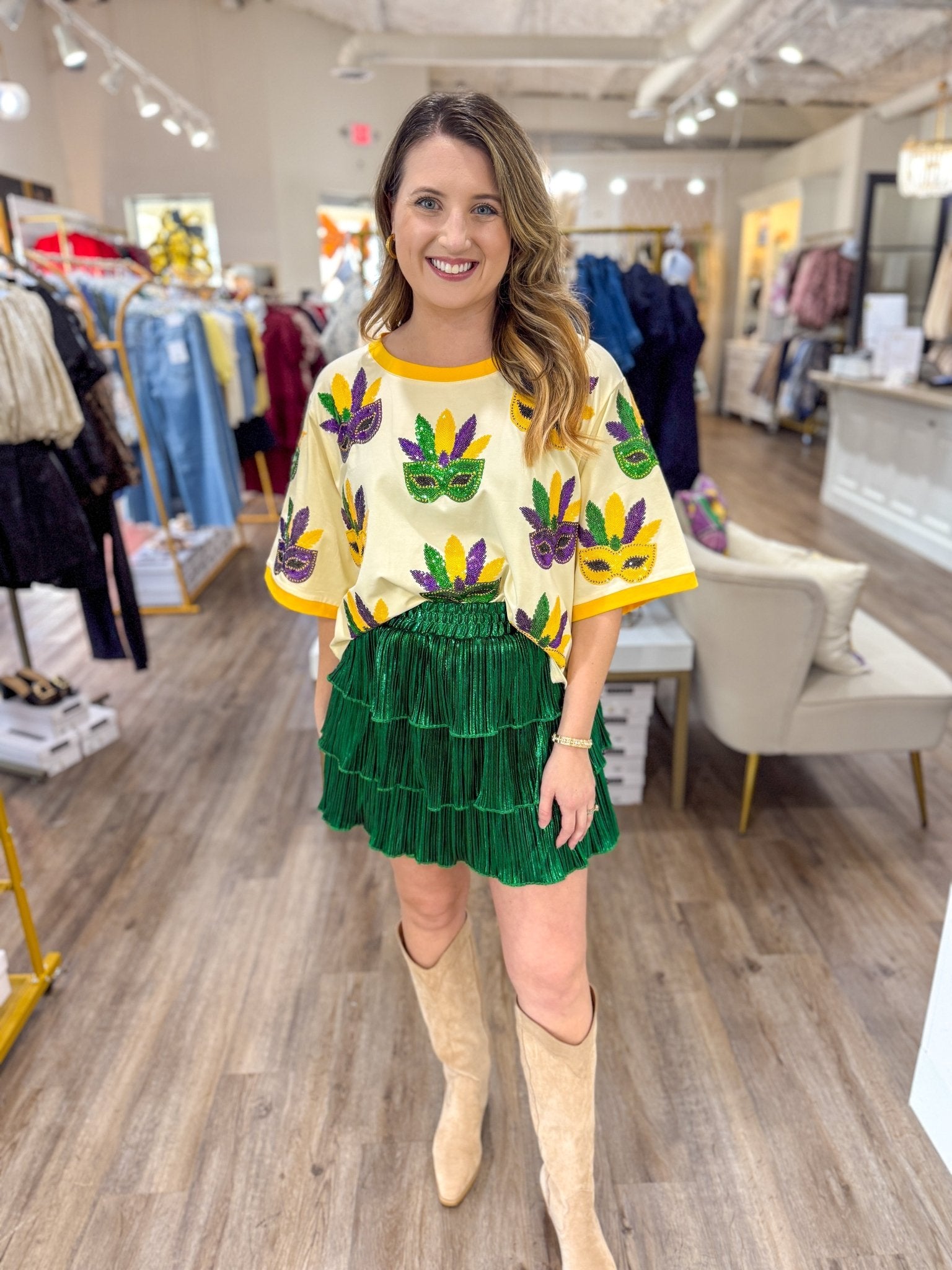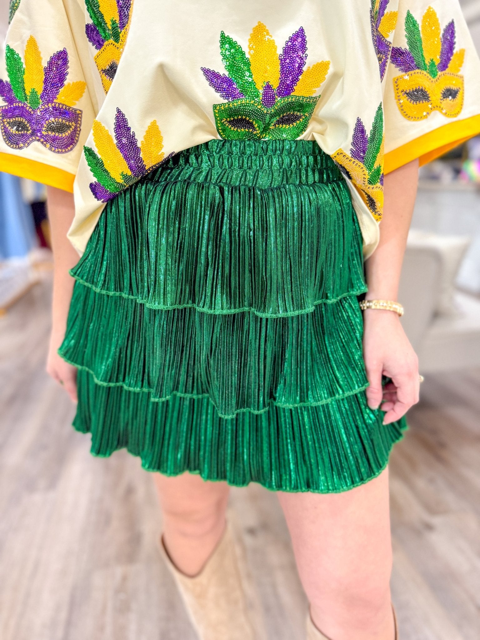 A festive favorite with built-in confidence. This shimmering ruffle skirt brings all the fun while the hidden shorts keep you covered and comfortable—perfect for game days, parties, and Mardi Gras moments.