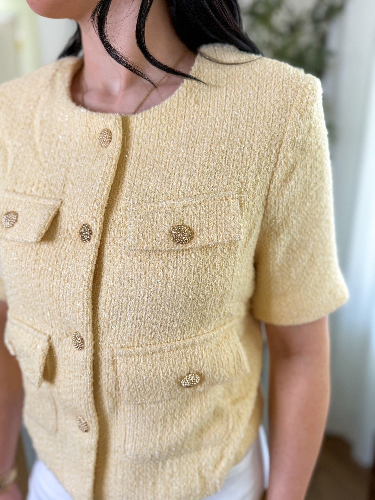 The Light Yellow Sweet & Sophisticated Tweed Top is a timeless statement piece with a soft, feminine twist. Featuring a structured silhouette and elegant textured fabric, this top instantly elevates any look while still feeling approachable and easy to wear.
