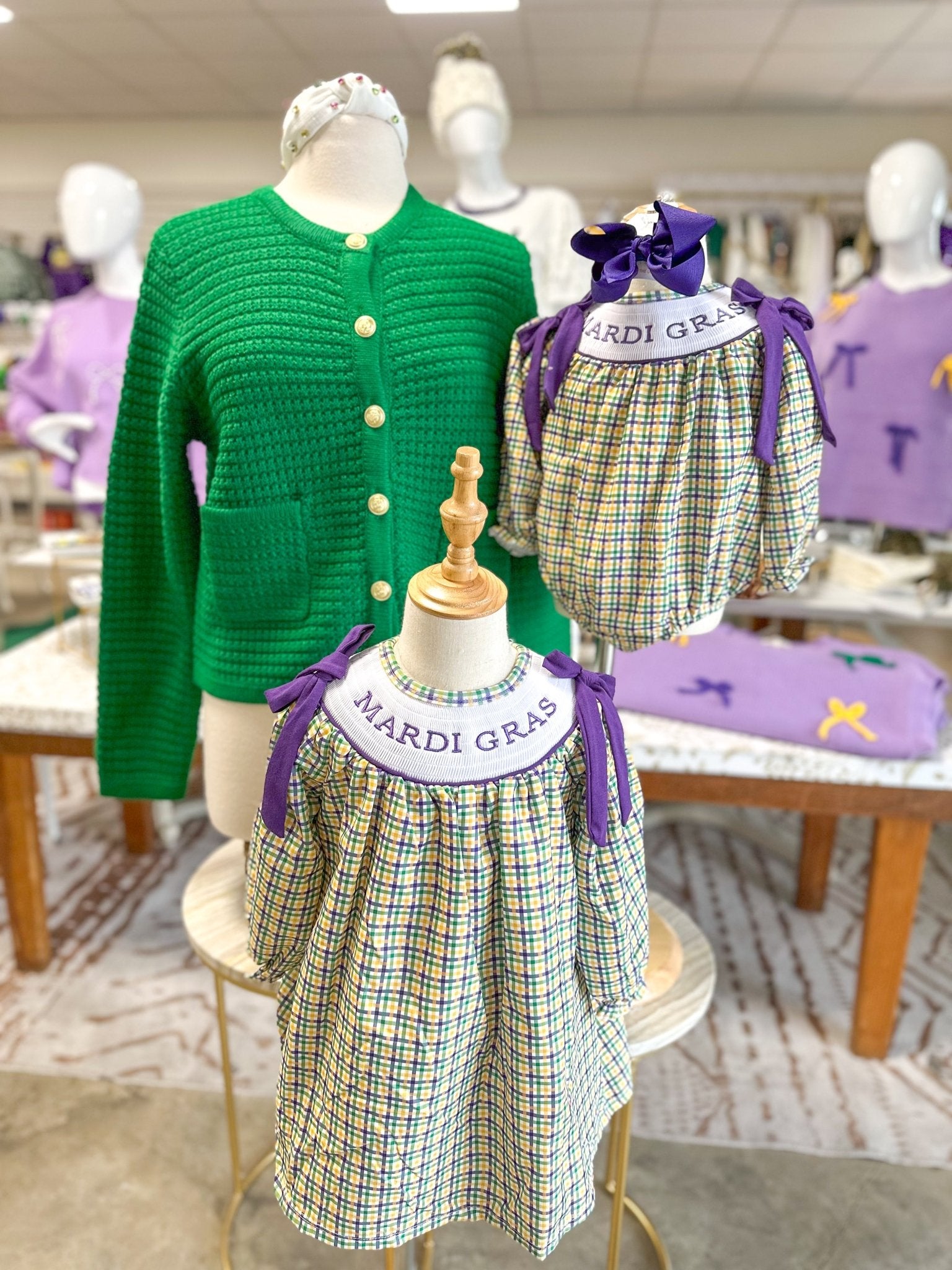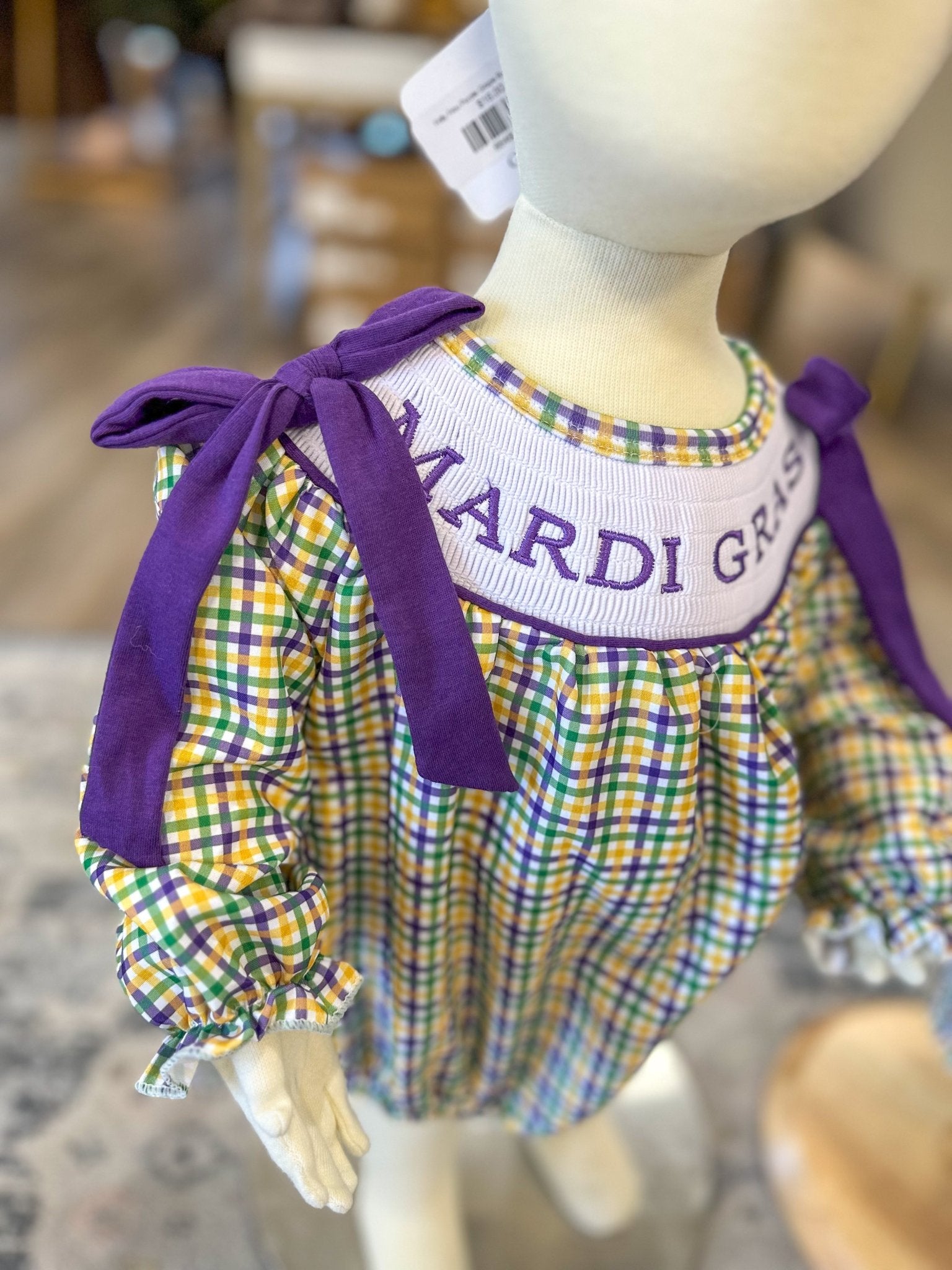 Mardi Gras Plaid Bow Detail Bubble - OMG Custom -- Get ready for a special Mardi Gras season with our latest, CUSTOM OOMG by Eden designs!