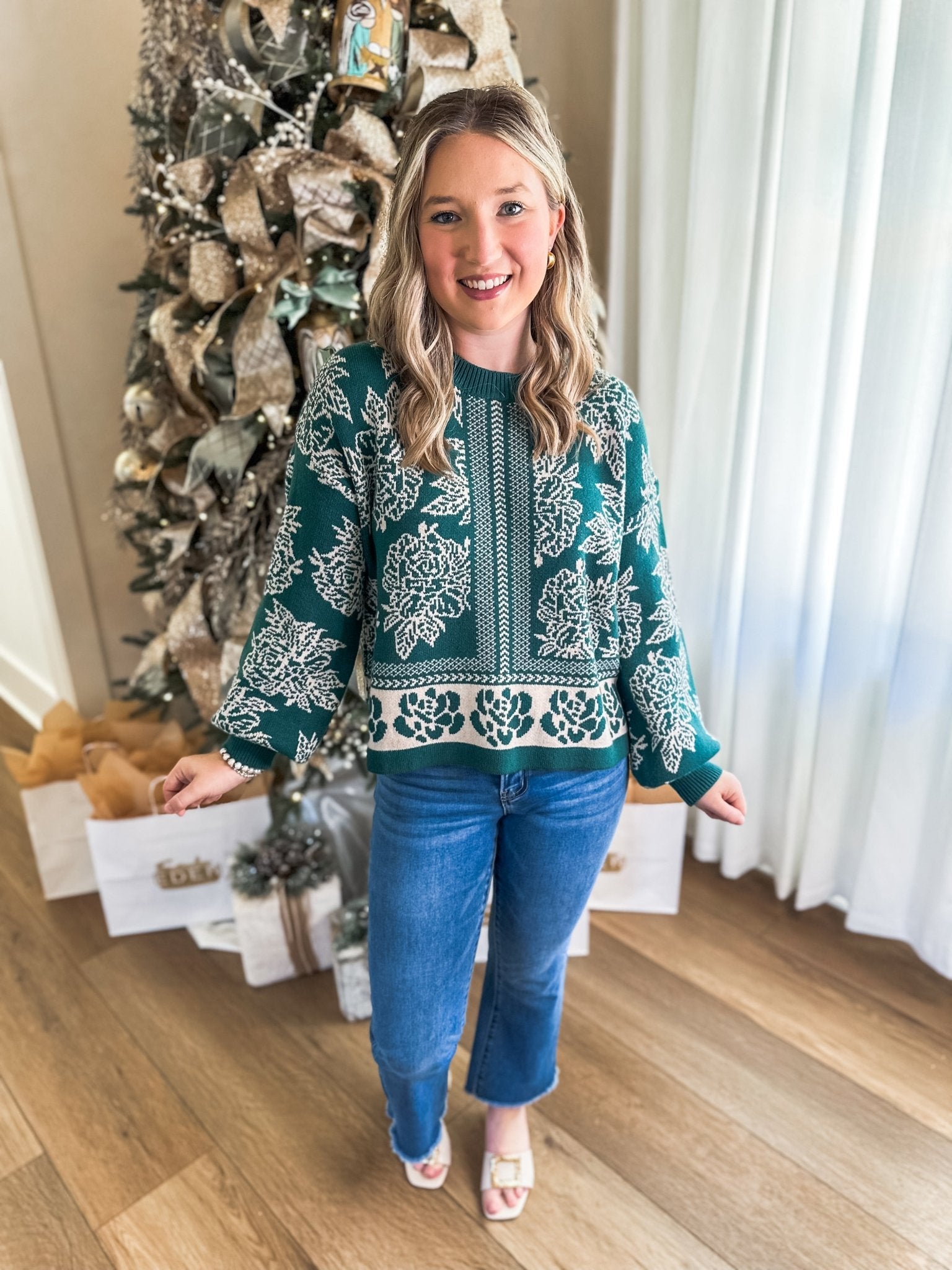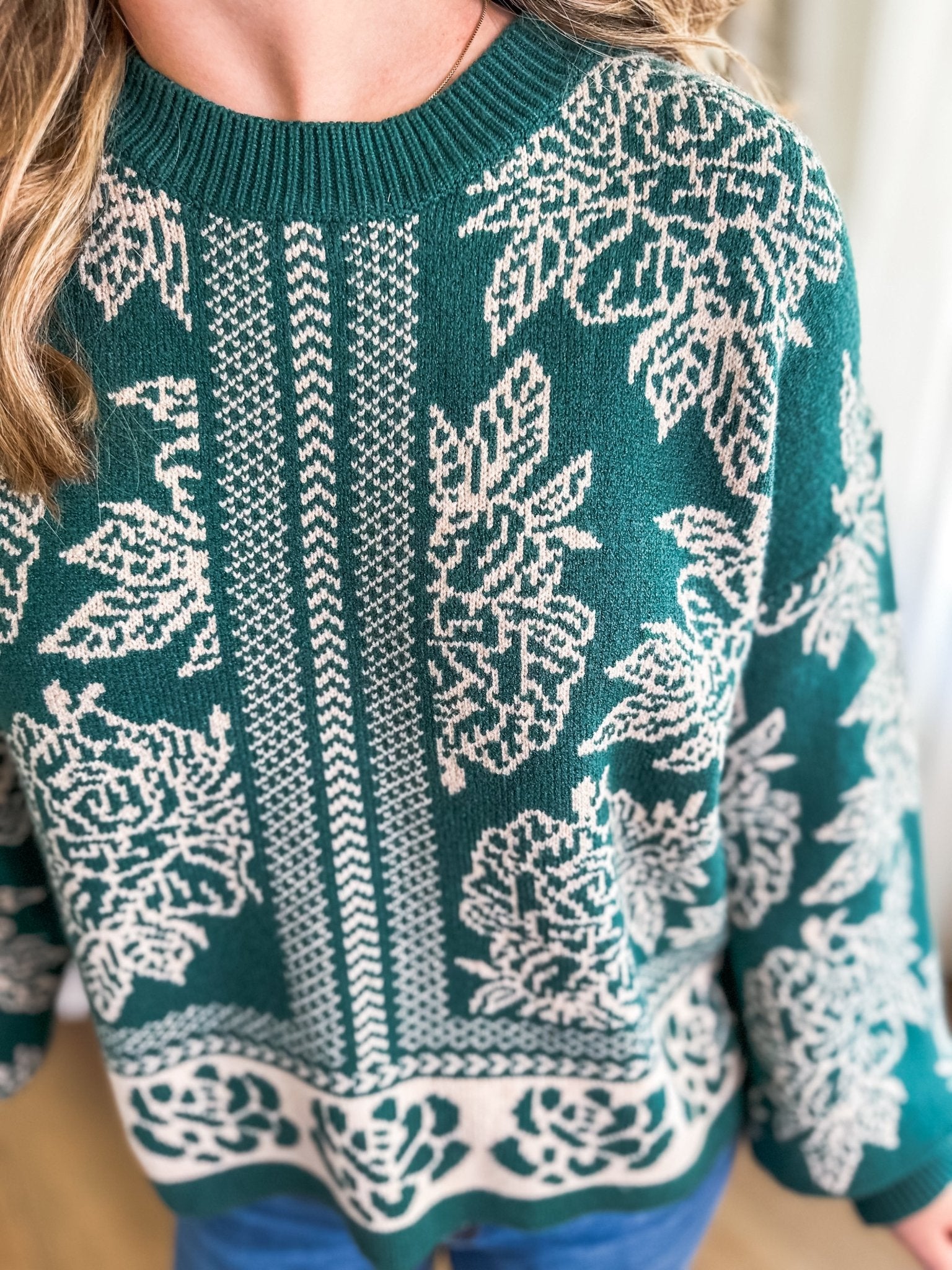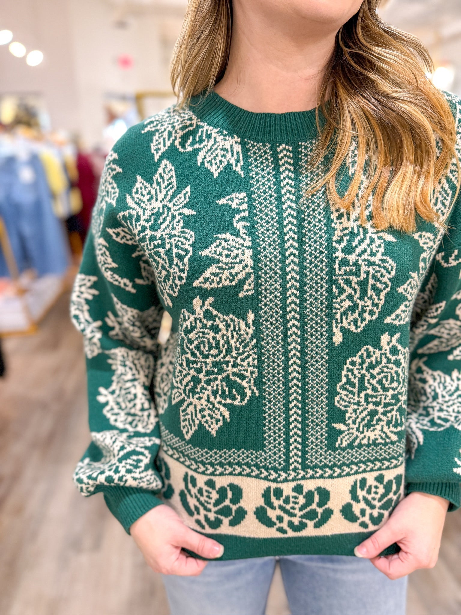 Romantic and timeless, the Pine Vintage Garden Sweater features a gorgeous cream floral knit pattern set against a rich green backdrop. The classic crew neckline and slightly relaxed fit make it a cozy yet elevated choice for cool days. Perfect with denim for casual charm or paired with a skirt for a more polished look.