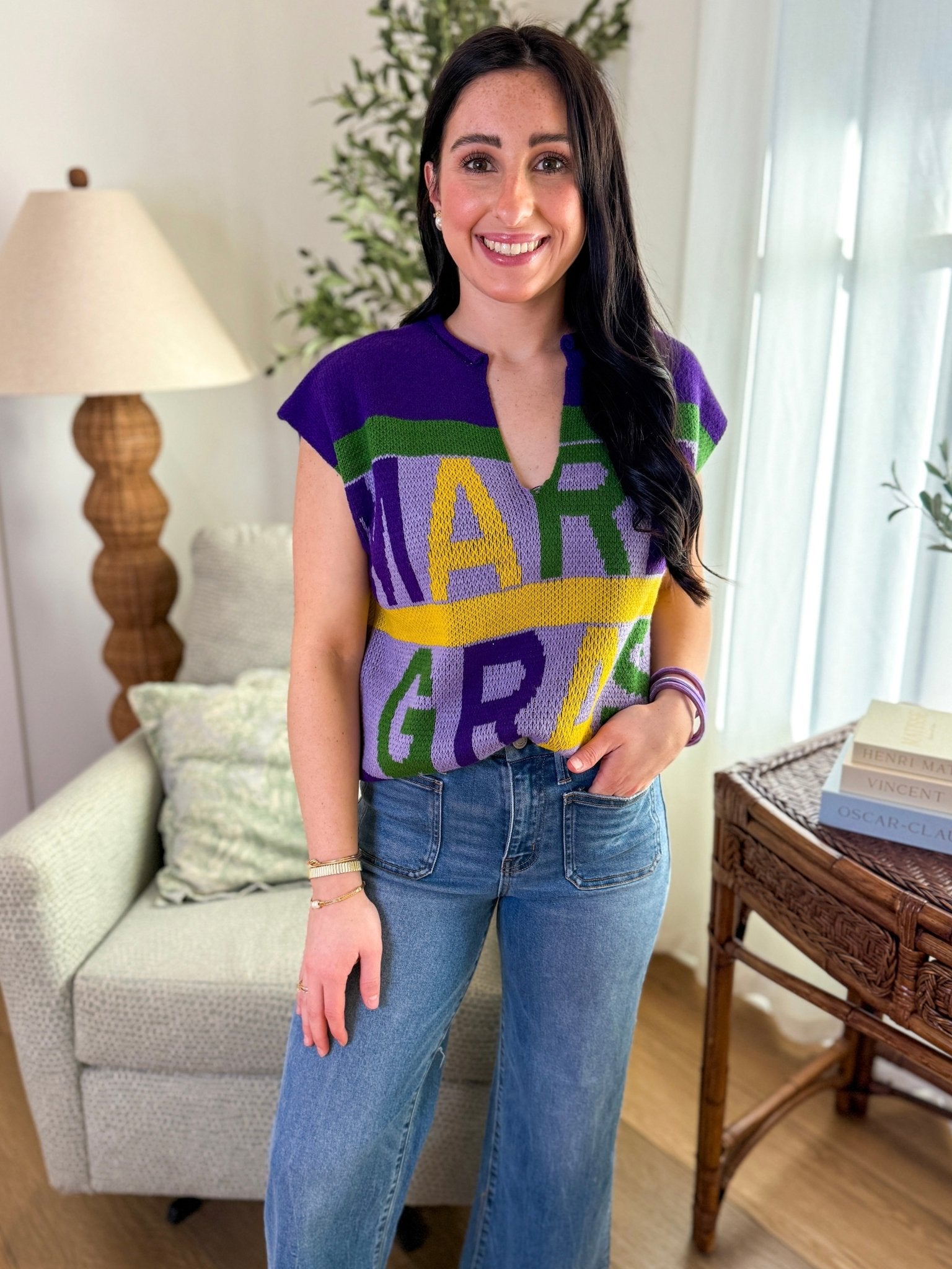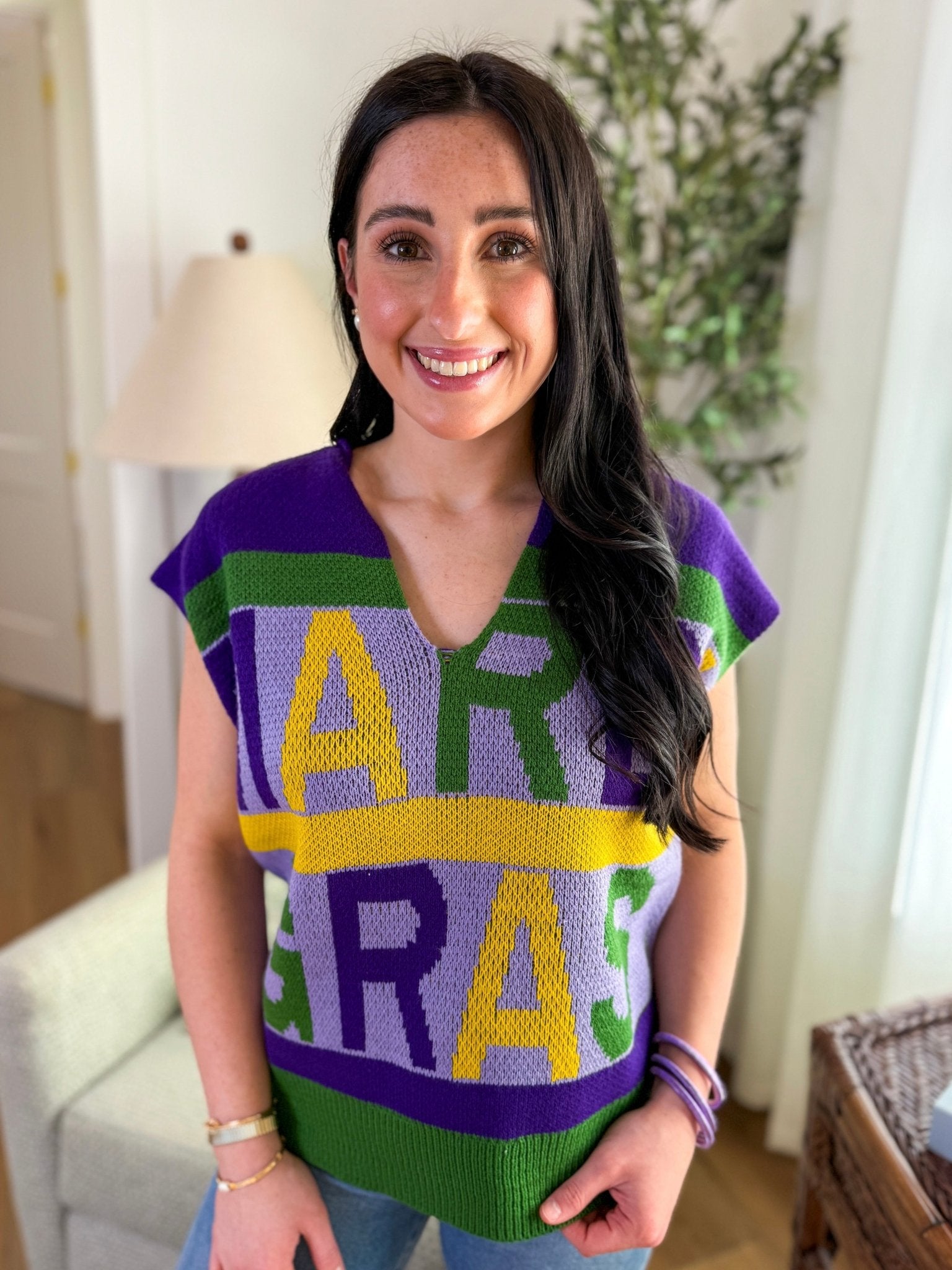 Design: Sleeveless sweater silhouette, split neckline, bold stripe pattern with statement lettering, ribbed hem, and eye-catching Mardi Gras color palette.