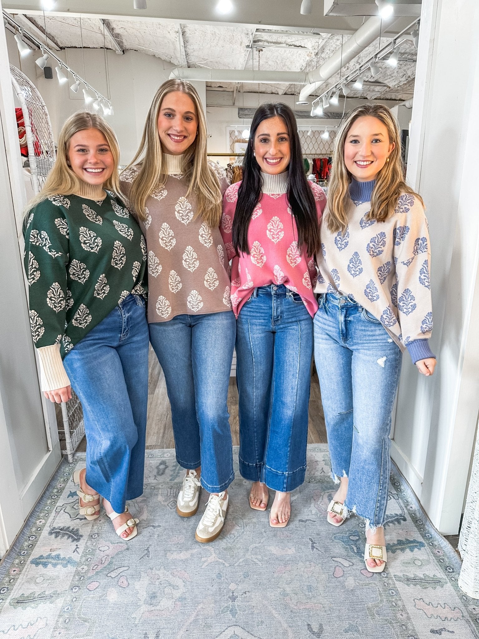 A cozy classic with a seasonal twist! This hunter green knit sweater is designed with a soft cream damask-inspired pattern and a contrast ribbed neckline for a chic touch. Perfect for layering into your holiday and winter wardrobe.