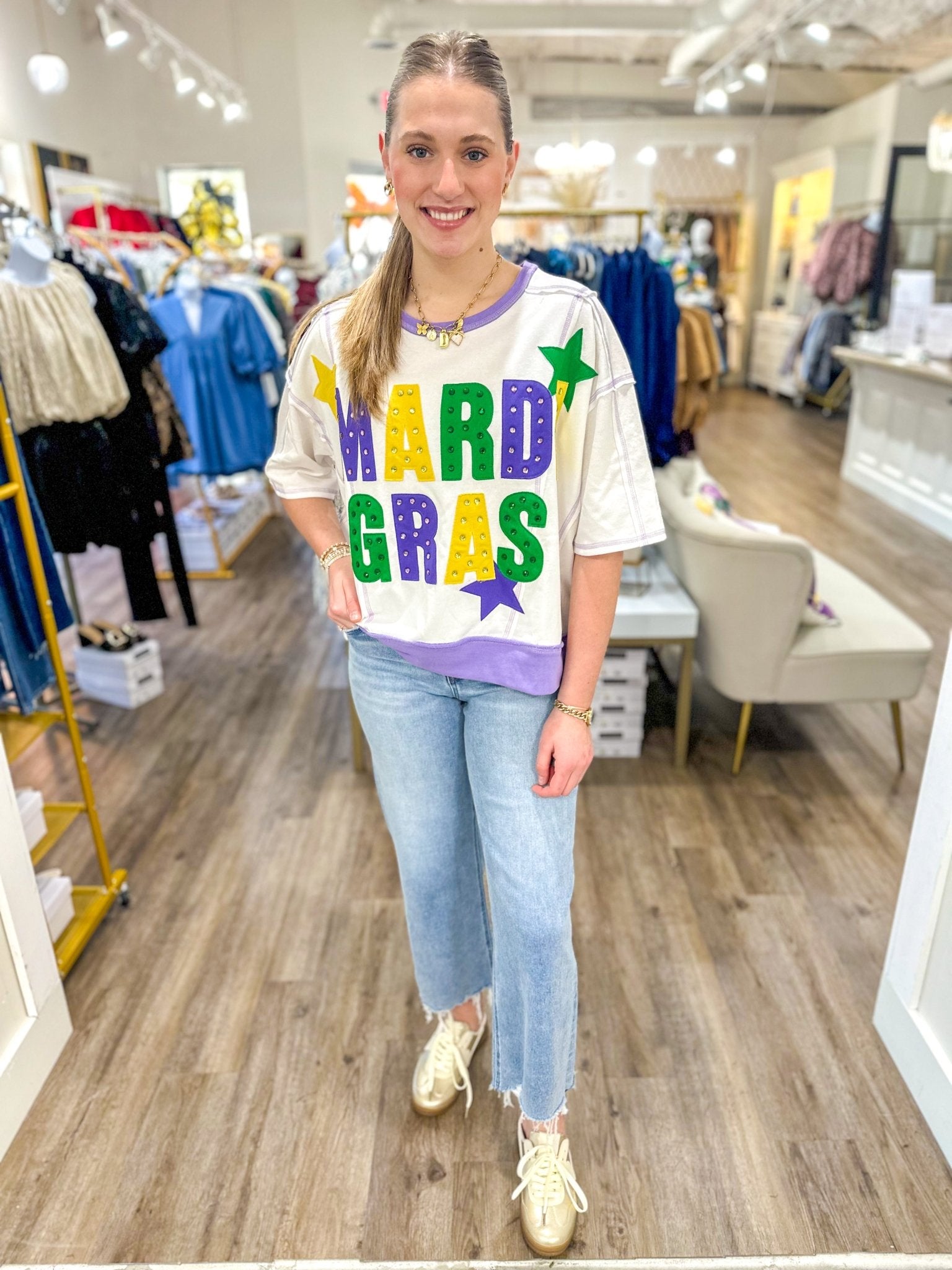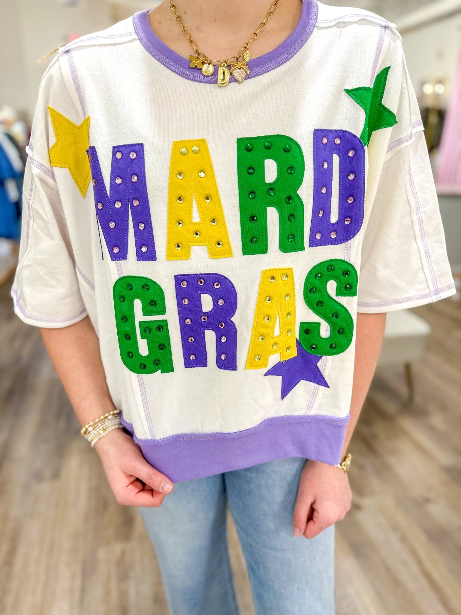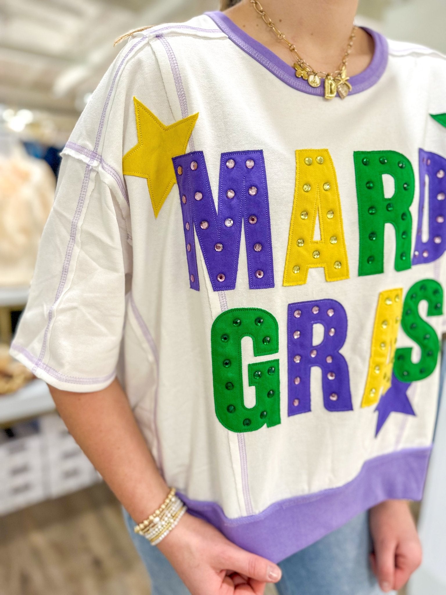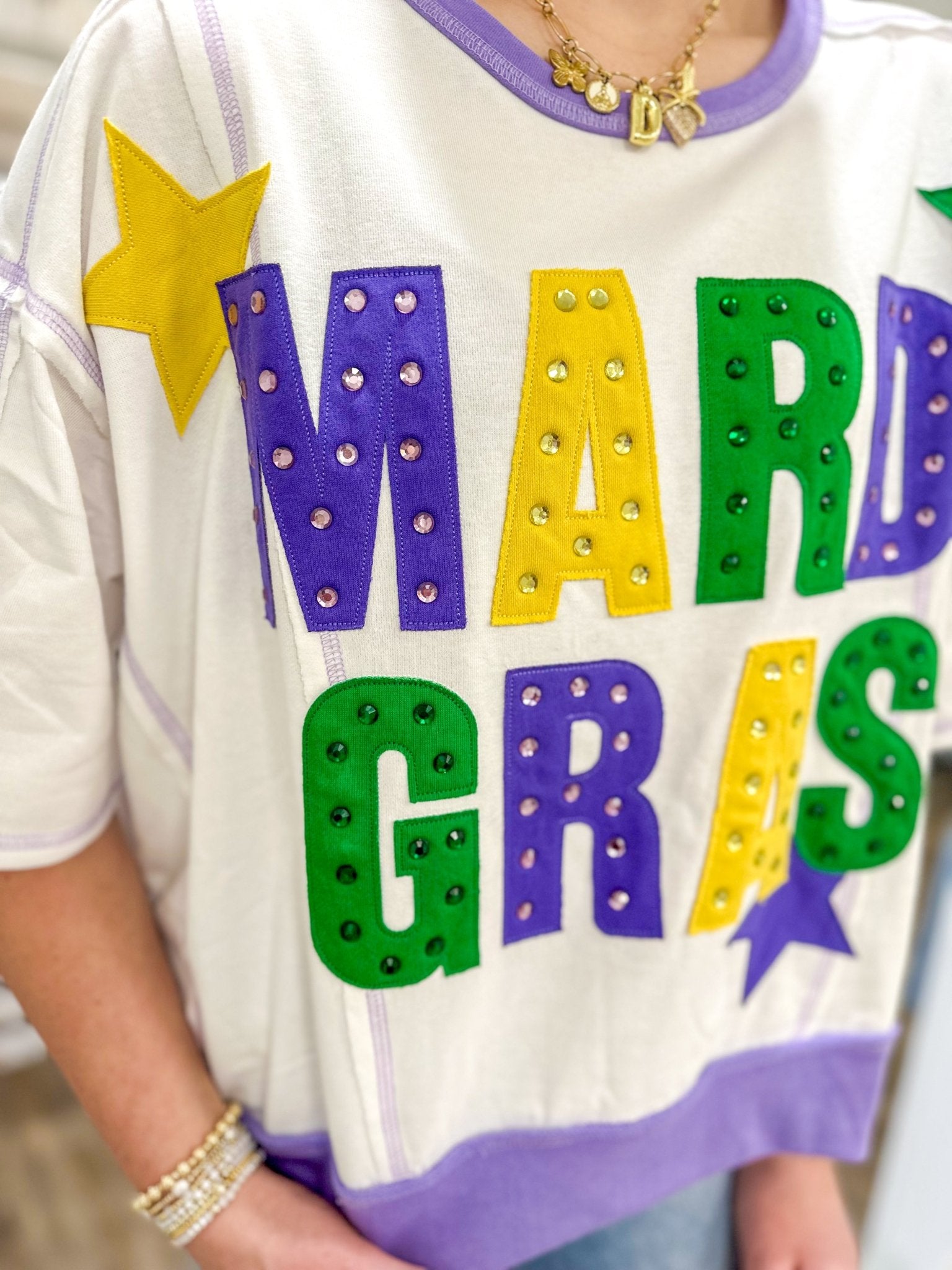 Fun, festive, and full of sparkle—this Mardi Gras sweatshirt is a standout piece you’ll love reaching for all season long. The bold color block lettering paired with rhinestone accents gives it just the right amount of shine while still feeling comfy and casual.
