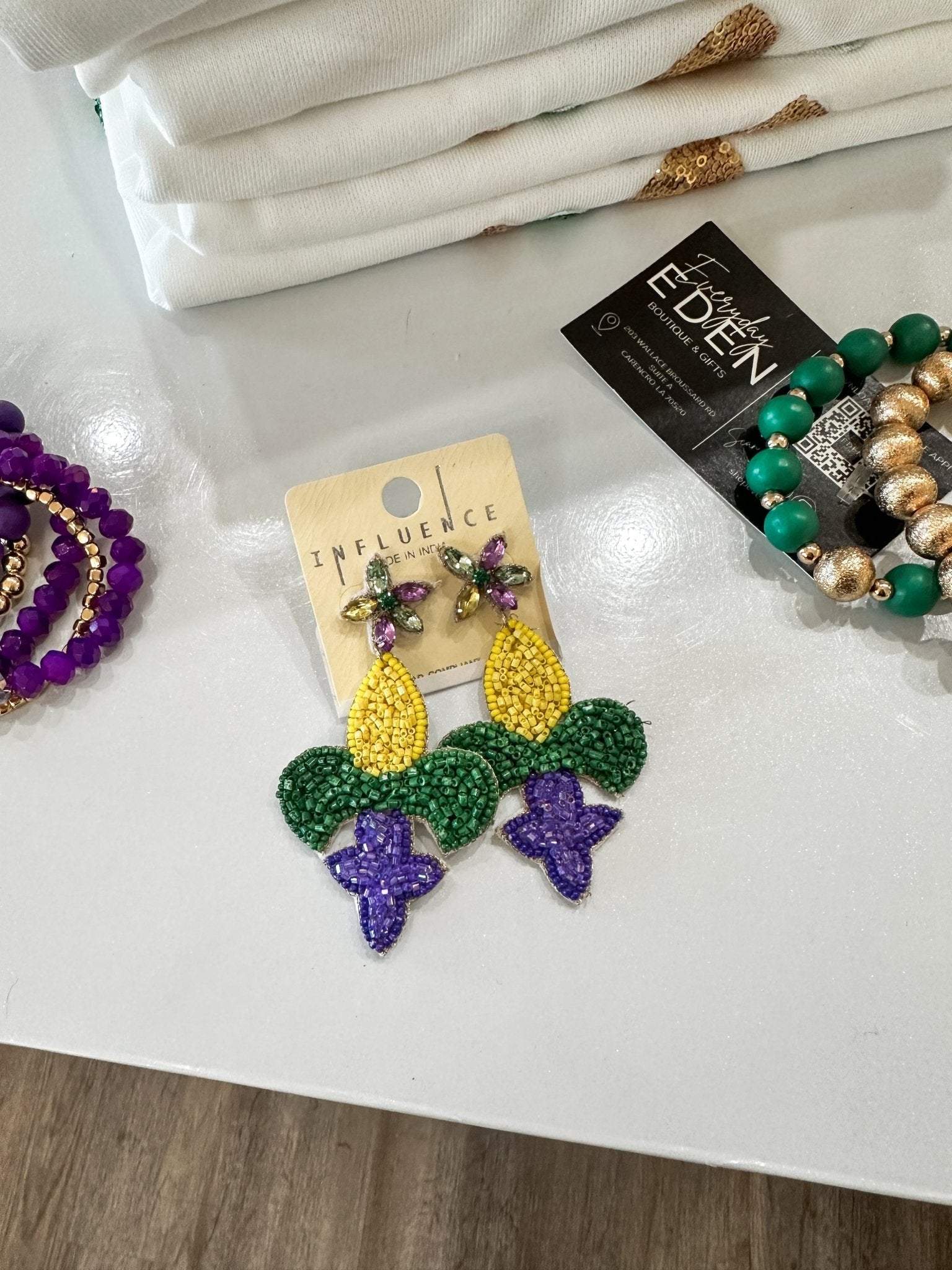 Let the good times roll in style! These festive beaded earrings are bursting with Mardi Gras spirit, featuring vibrant purple, green, and gold beads in a playful design. Lightweight and fun, they’re the perfect accessory for parades, parties, and all your Carnival celebrations.
