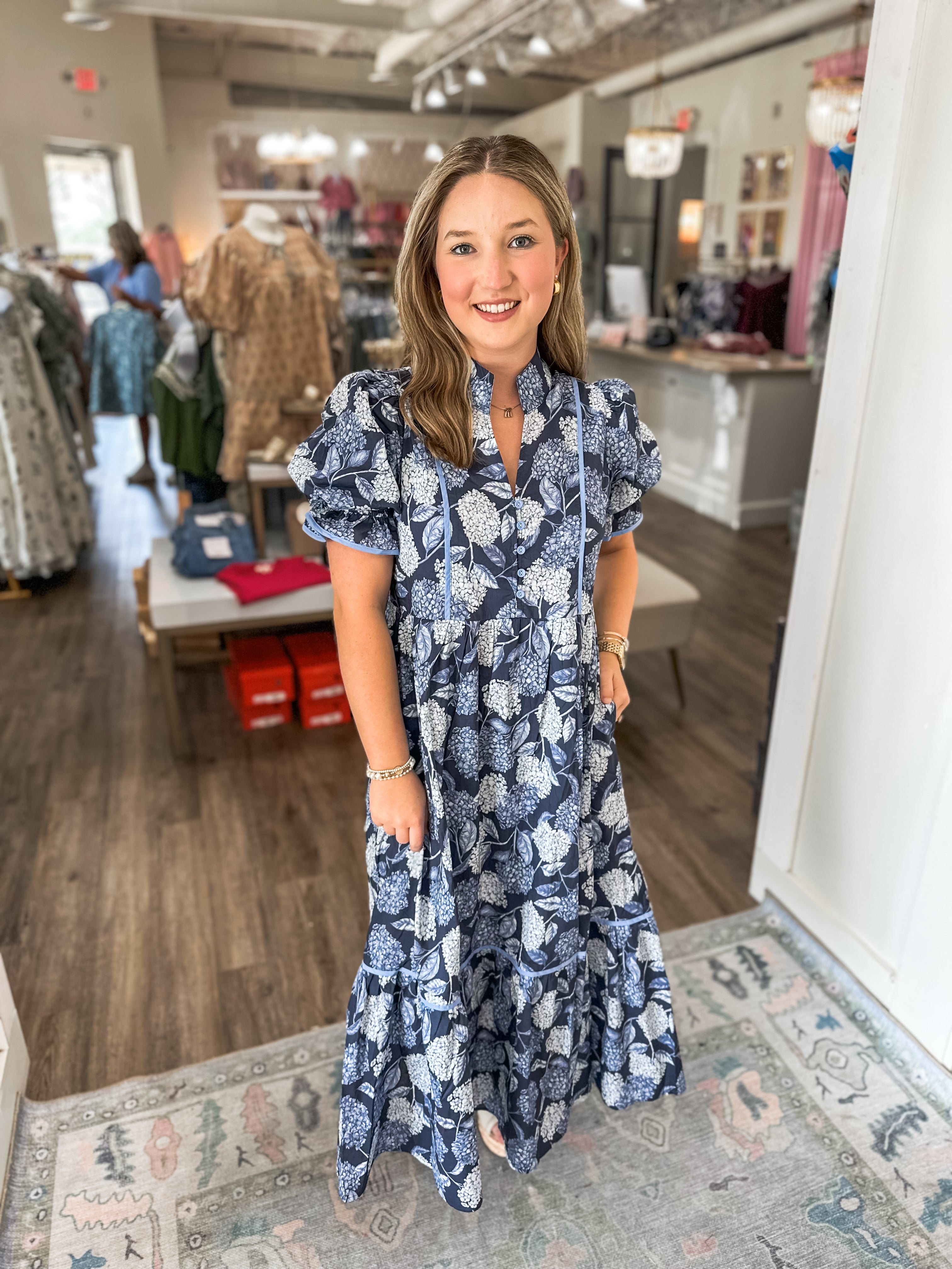 Romantic and ready for sunshine, the Hydrangea Hill Puff Sleeve Dress is blooming with beauty! With its soft navy base and white floral print, this dress brings a vintage-inspired feel to modern everyday wear. Puffed sleeves, a flattering empire waistline, and flowy midi length make it a go-to for garden parties, brunch dates, or church on Sunday. And yes—there are pockets!