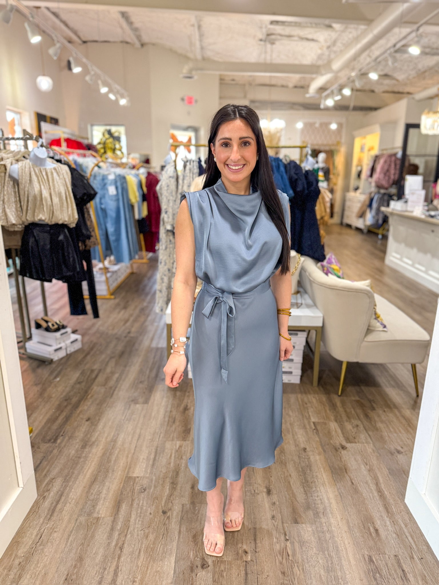 Chic and timeless with a soft, romantic feel, this satin midi dress features a graceful draped neckline and an adjustable waist tie for an effortlessly flattering fit. Perfect for weddings, showers, or elevated evenings out.