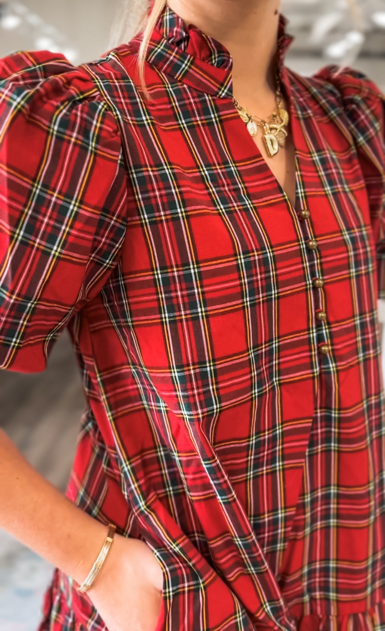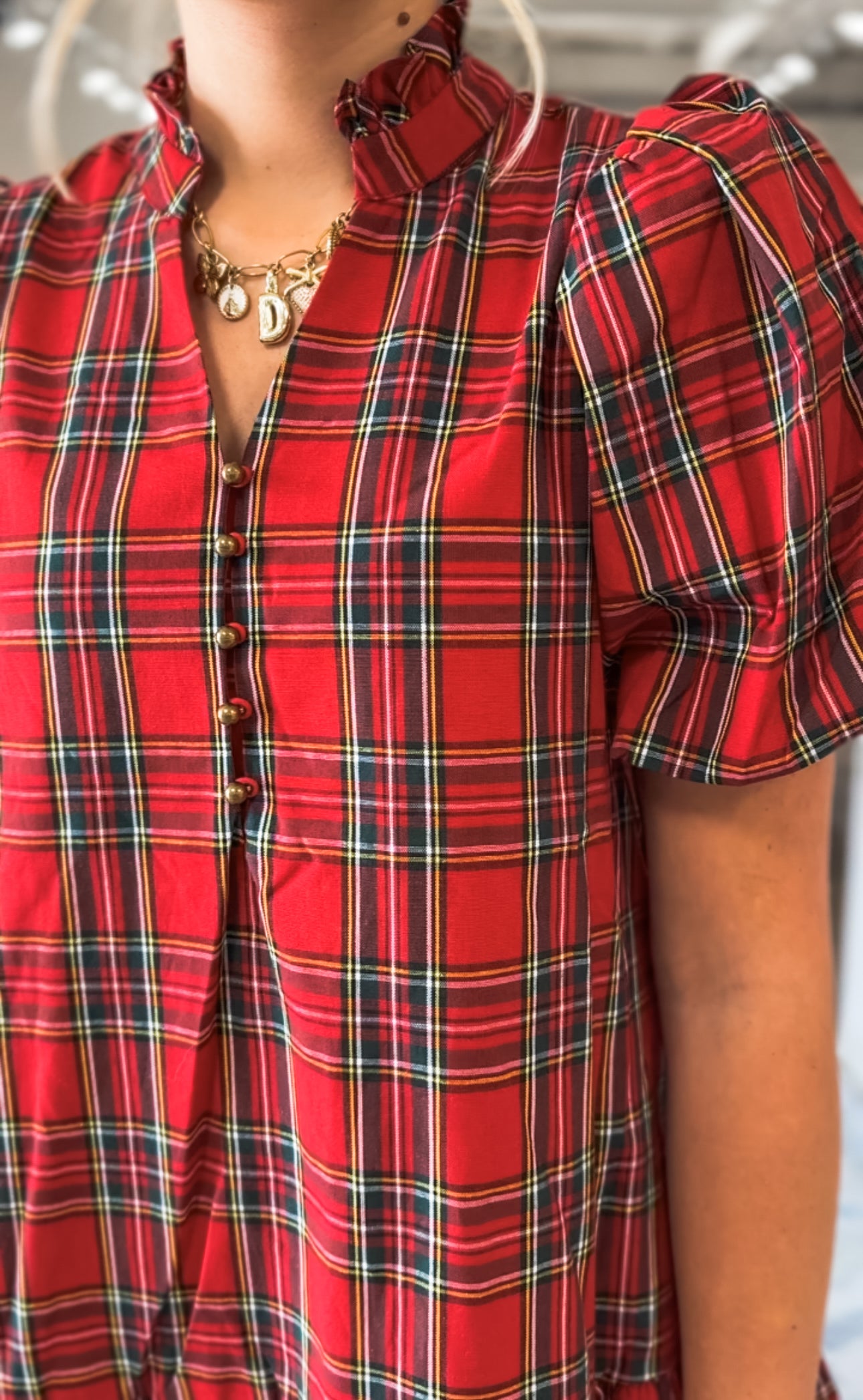 Festive and full of charm, the Merry Moments Mini Dress is perfect for holiday gatherings, seasonal photos, or a night out feeling merry and bright. This red plaid dress features a ruffle mock neckline, gold button-front detail, puff short sleeves, and a flirty tiered hem for a playful touch.