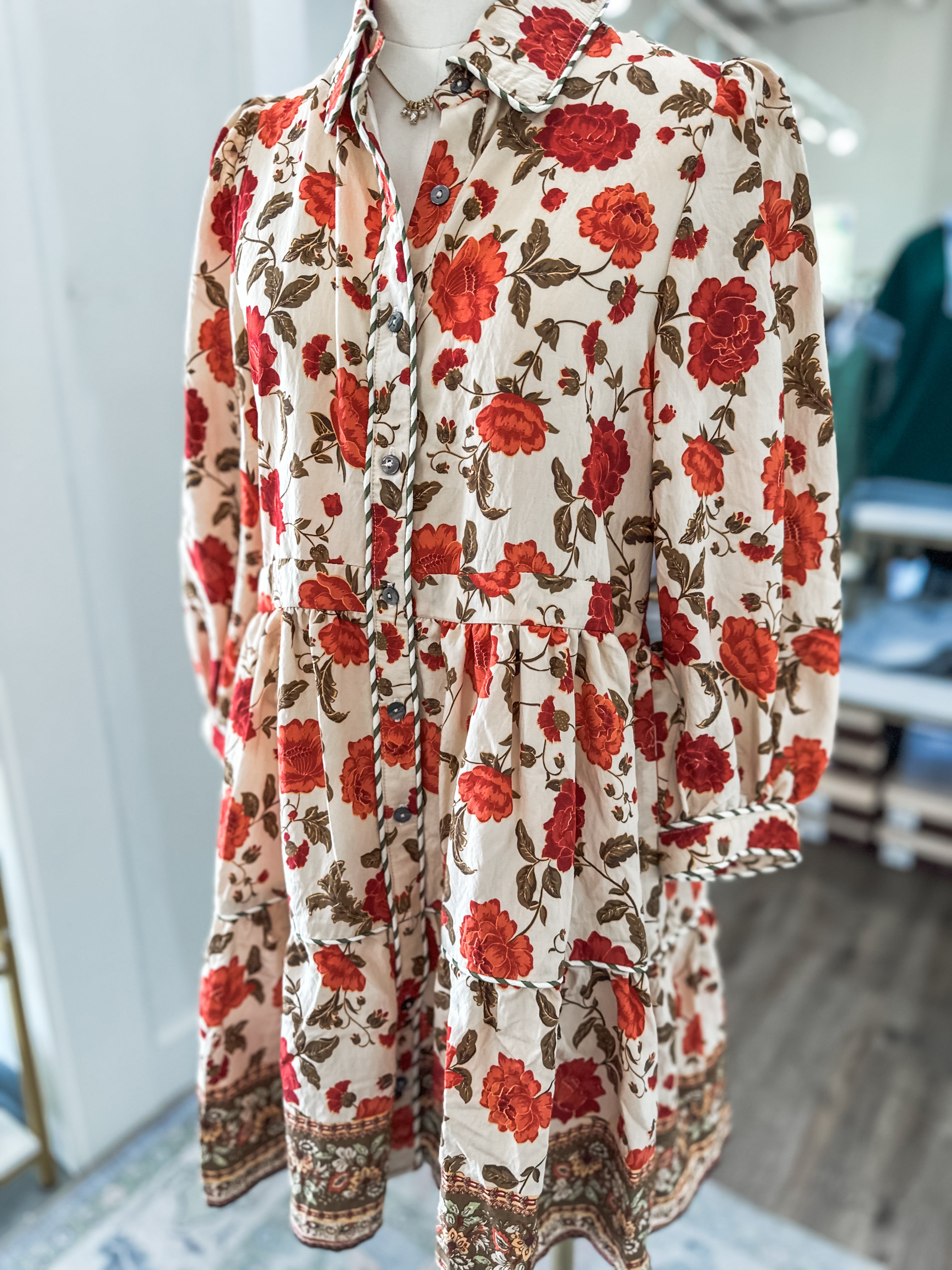 Bring charm to your fall wardrobe with the Harvest Honey Ecru Mini Dress. This sweet and feminine style pairs delicate florals with an easy, flowy fit—perfect for seasonal gatherings, brunch dates, or even Thanksgiving with the family.