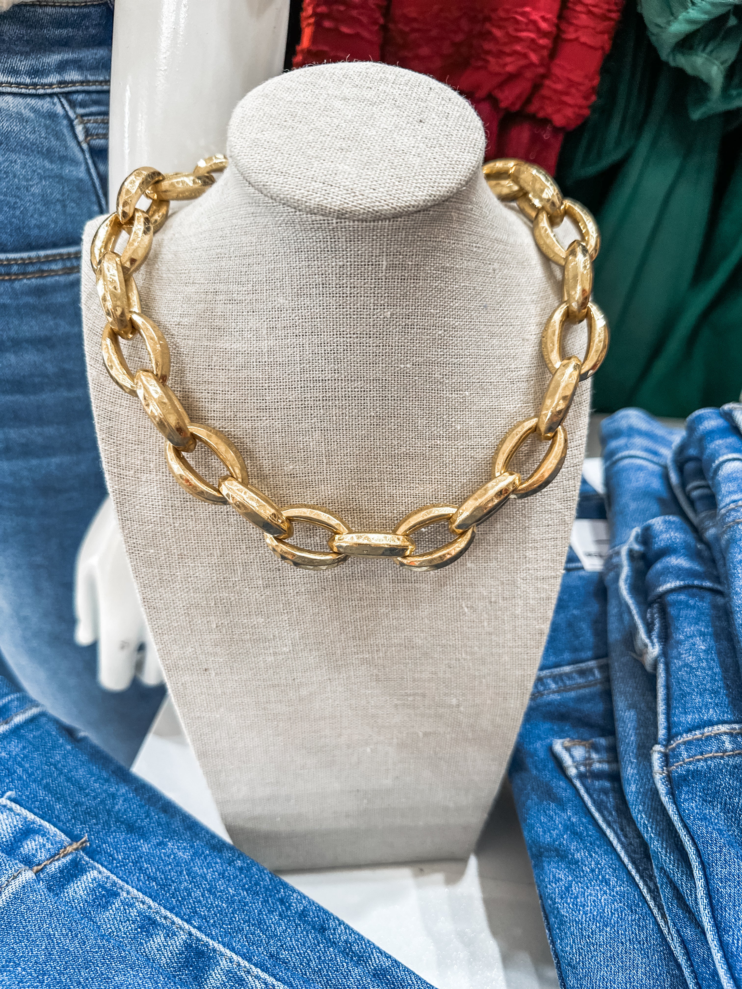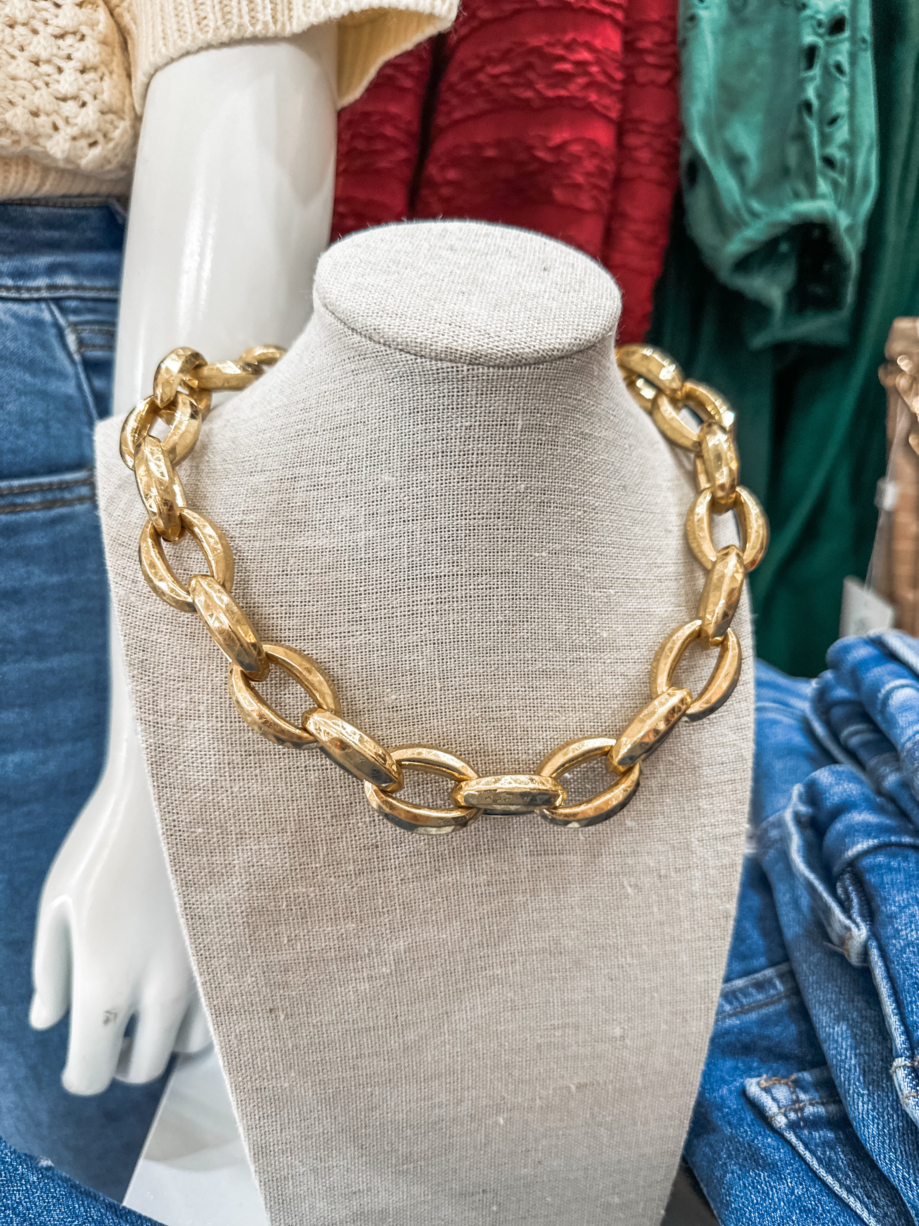 This bold gold necklace adds the perfect amount of shine to elevate any outfit — from cozy sweaters to dressy holiday looks. The chunky layered links give a luxe, high-end feel while still being lightweight and easy to wear all day.