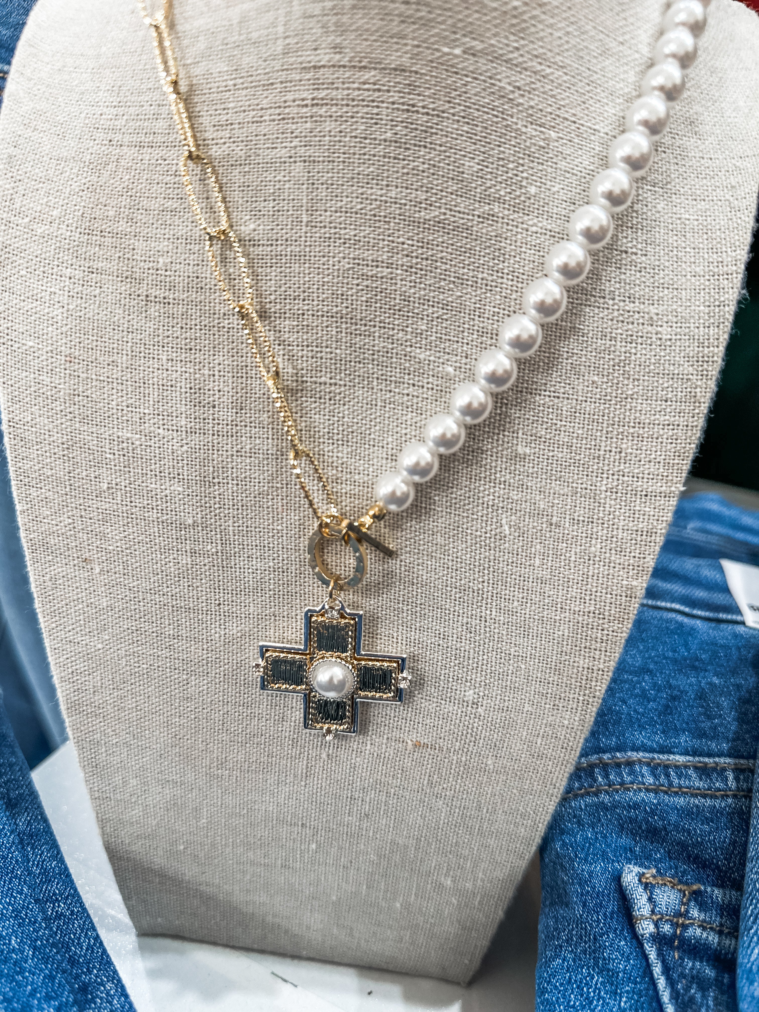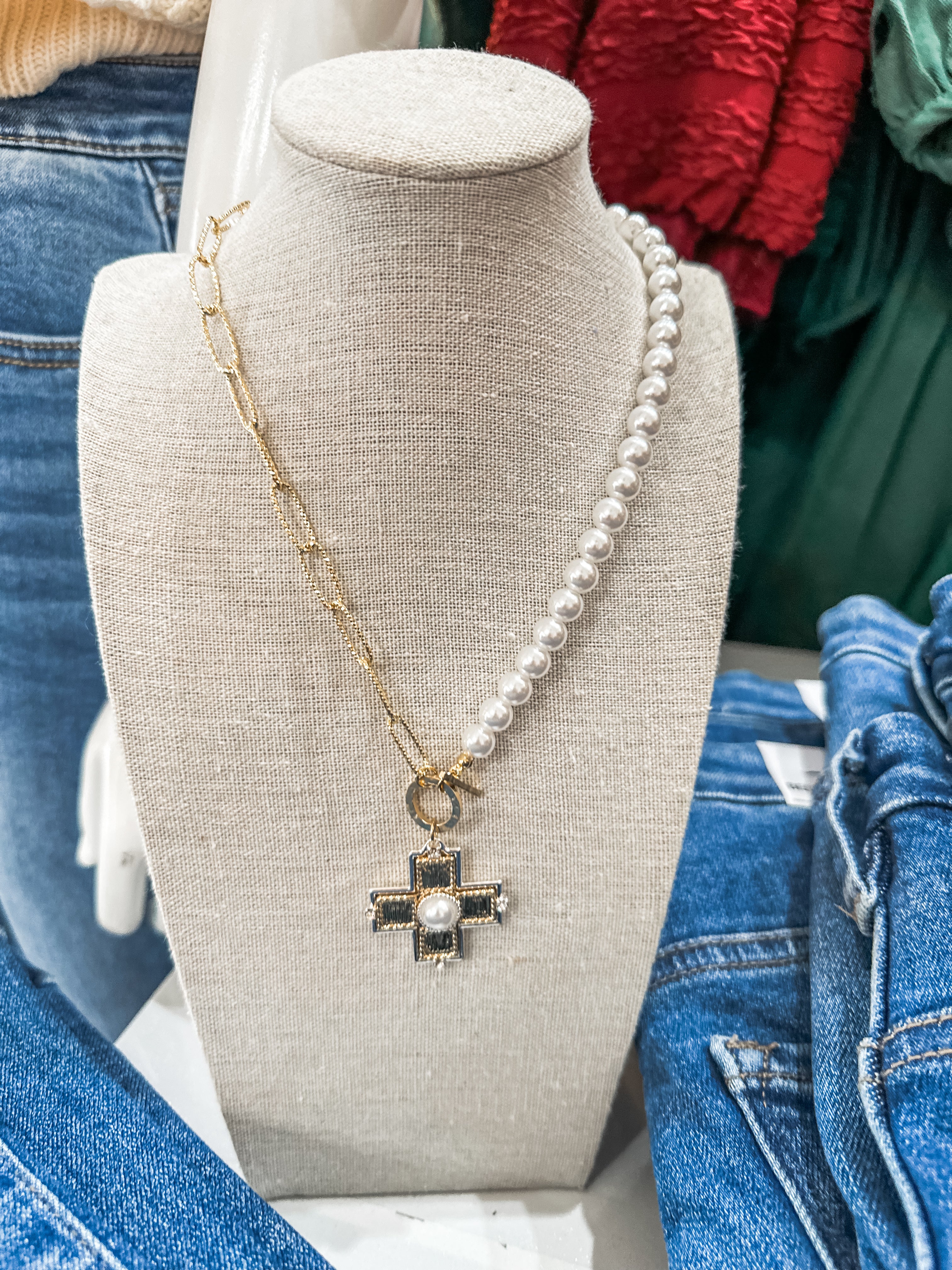 A stunning blend of edgy gold chain links and classic pearls, finished with the most beautiful textured cross charm. This piece adds instant polish and meaning to any outfit — perfect for layering or wearing solo as a statement.