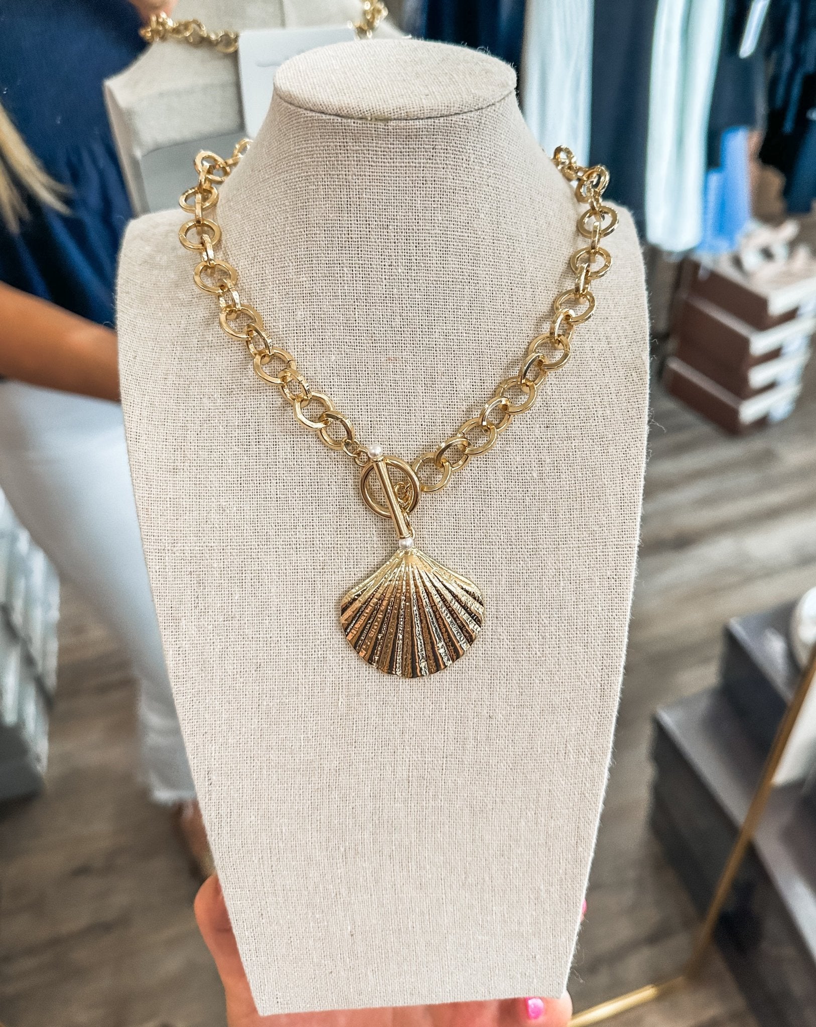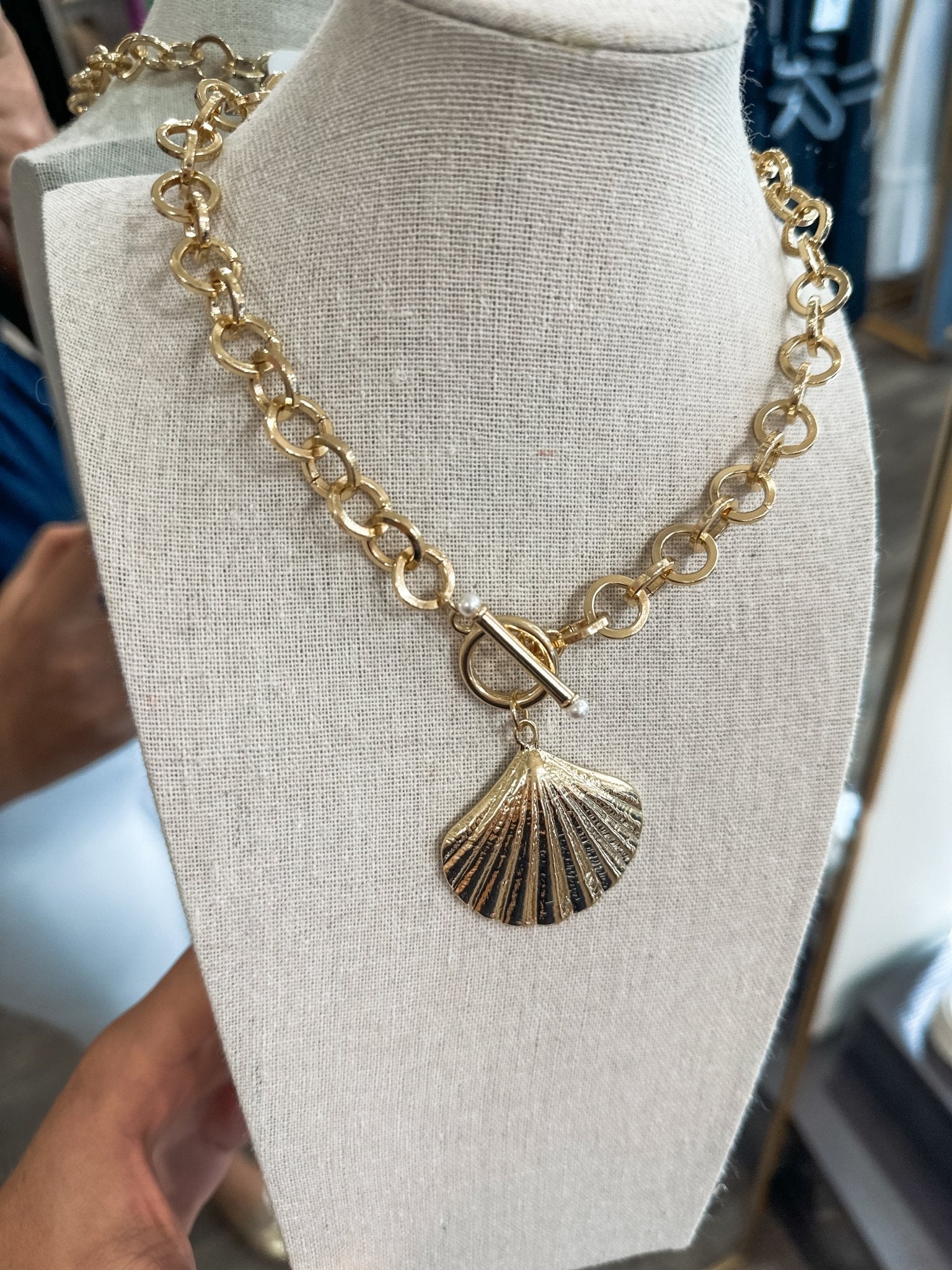 Bring beachside elegance to your everyday with our Golden Shore Shell Necklace. Featuring chunky gold open circle links and a textured, hammered shell pendant, this statement piece adds a coastal charm to any look. Finished with a toggle clasp for easy wear and extra flair—it’s the perfect blend of bold and breezy.