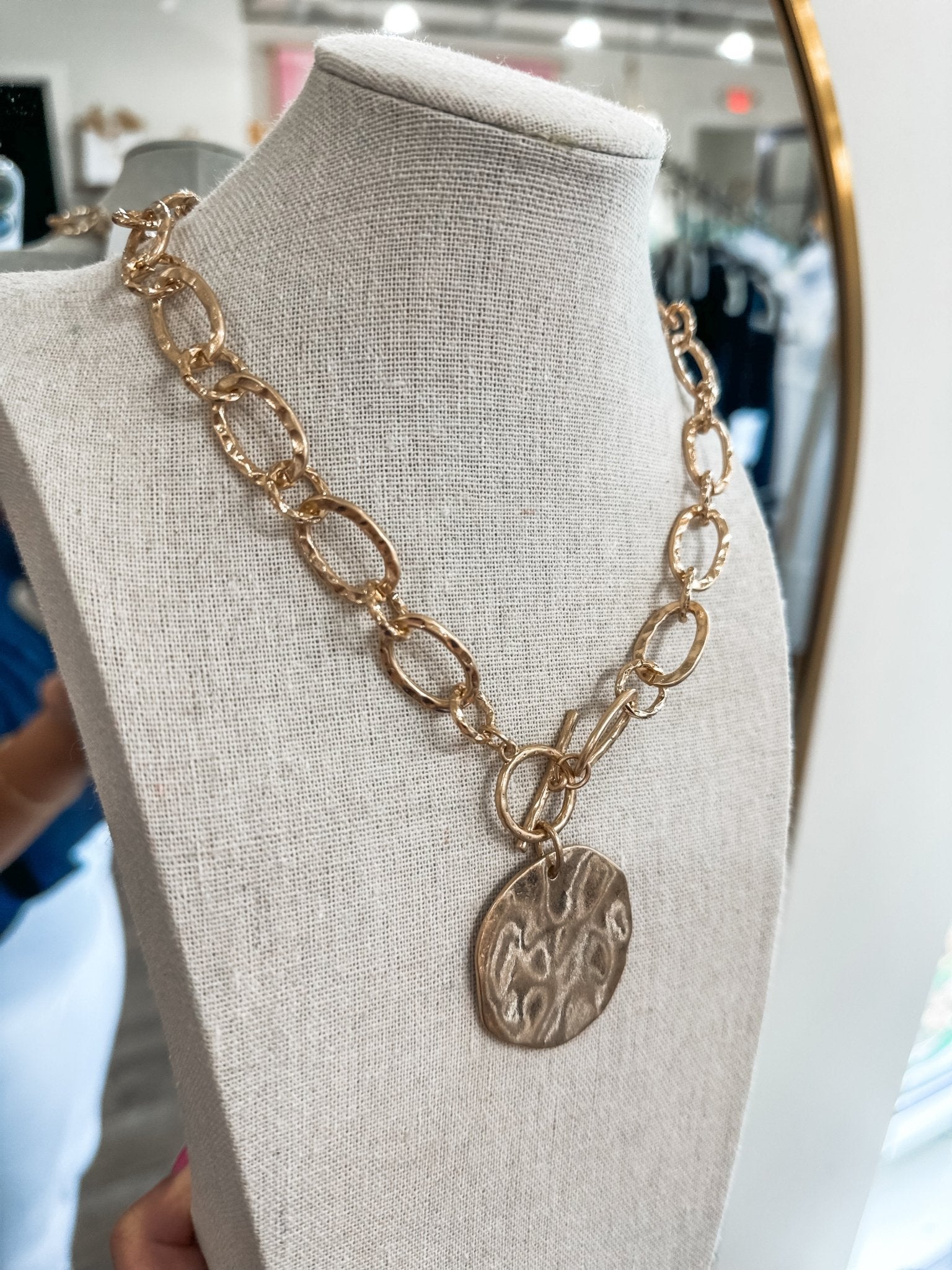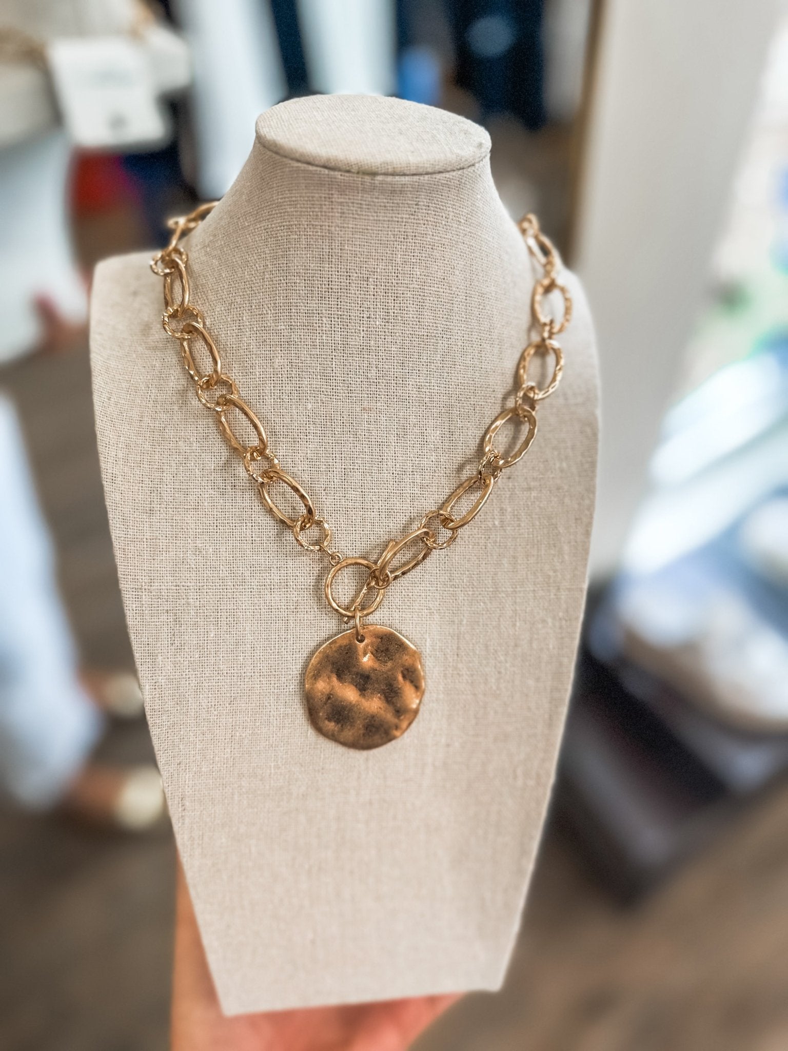 Striking the perfect balance of bold and minimal, the Golden Tide Coin Necklace features oversized open gold links and a hammered disc pendant with organic texture. Whether you’re layering it up or letting it shine solo, this 16”-18” stunner adds effortless glam to your everyday rotation. Finished with an adjustable clasp for the perfect fit.