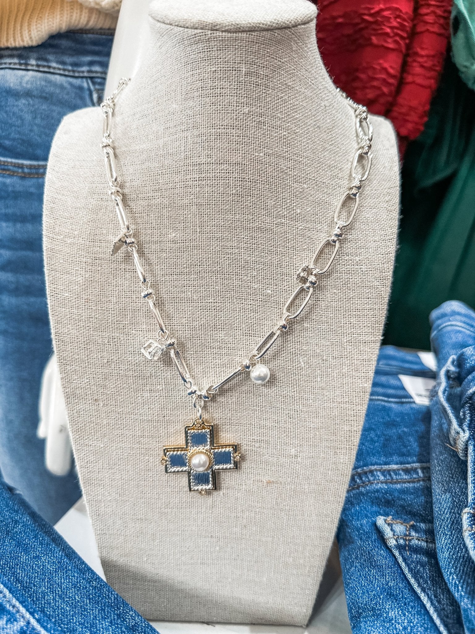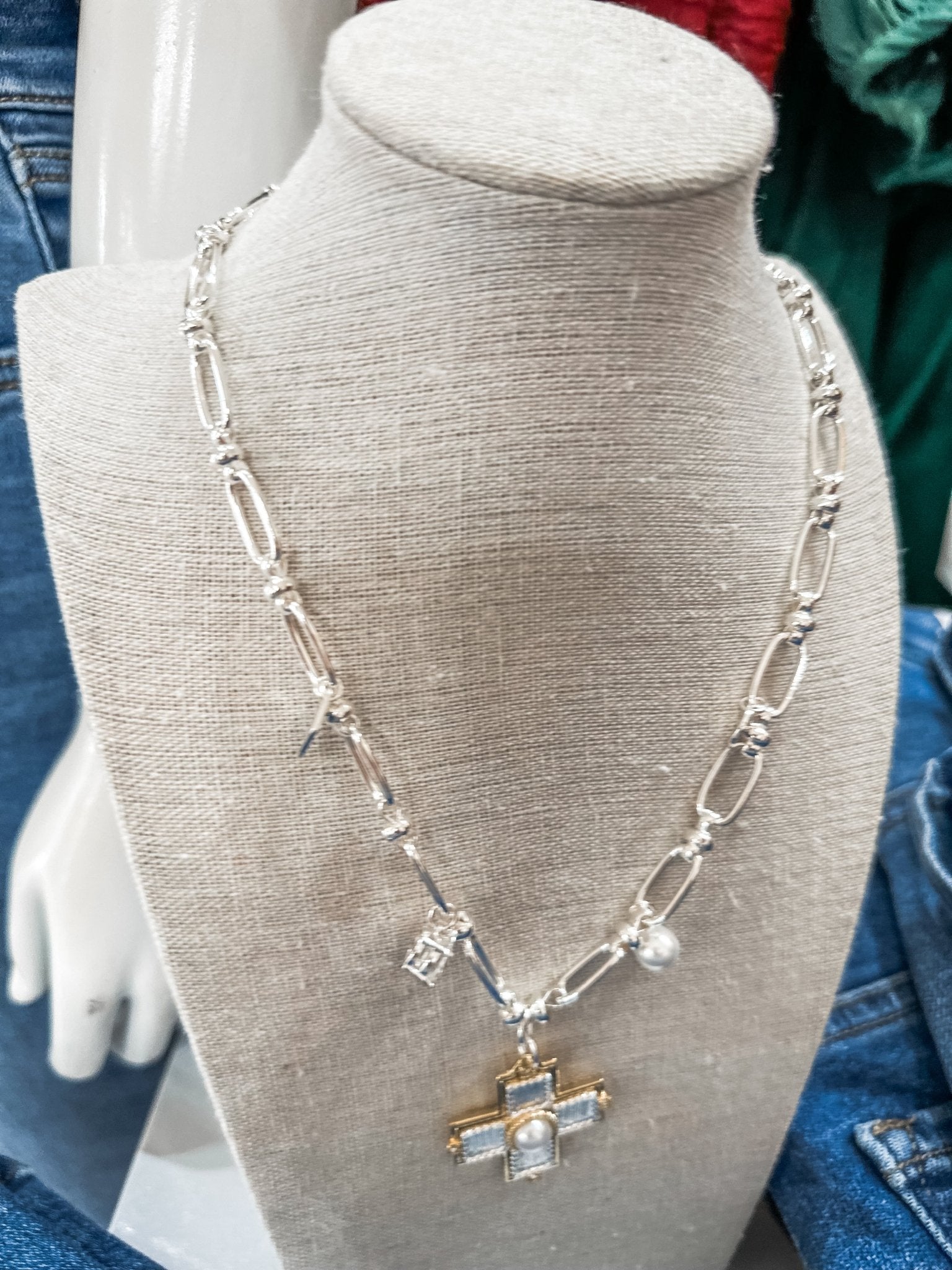 A chic, modern twist on a classic charm necklace — this silver open-link chain is finished with a textured cross pendant and dainty pearl accents for the perfect blend of shine and softness.