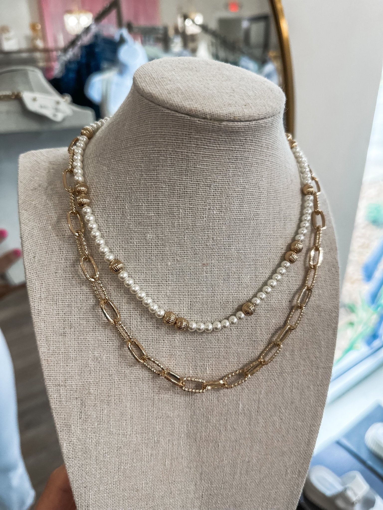 Elevate your layers with this chic Water Resistant Double Layered Pearl Beaded & Chain Necklace. A luxe blend of dainty faux pearls and edgy gold chain links creates the ultimate statement combo—no stacking required. Finished with gold bead accents and a 16”-18” adjustable fit, it’s water-resistant and ready to wear all day, every day. Dress it up or down—this piece does it all.