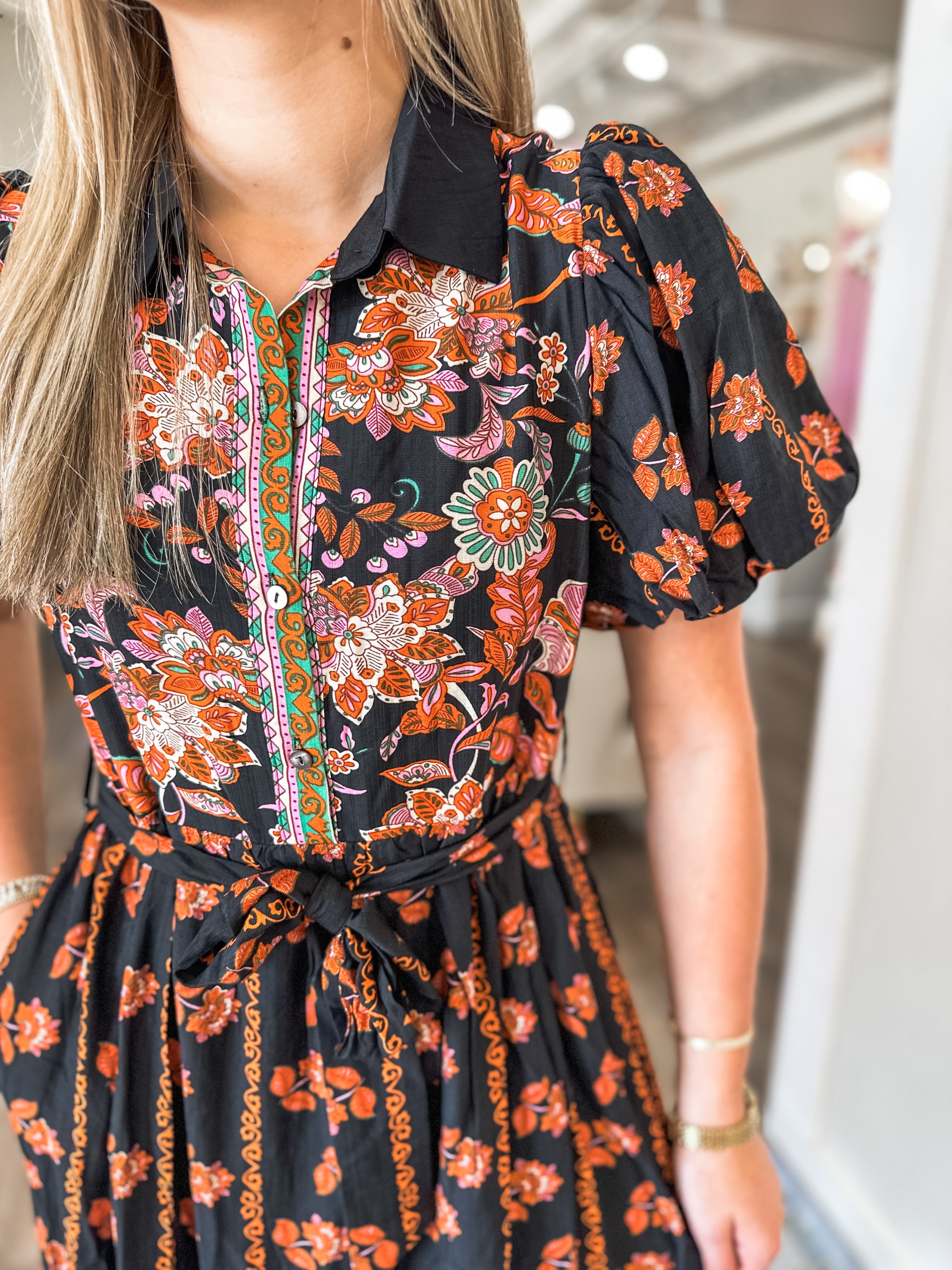 The perfect fall statement dress for seasonal gatherings, family photos, or a night out—this dress combines comfort with an eye-catching autumn print.