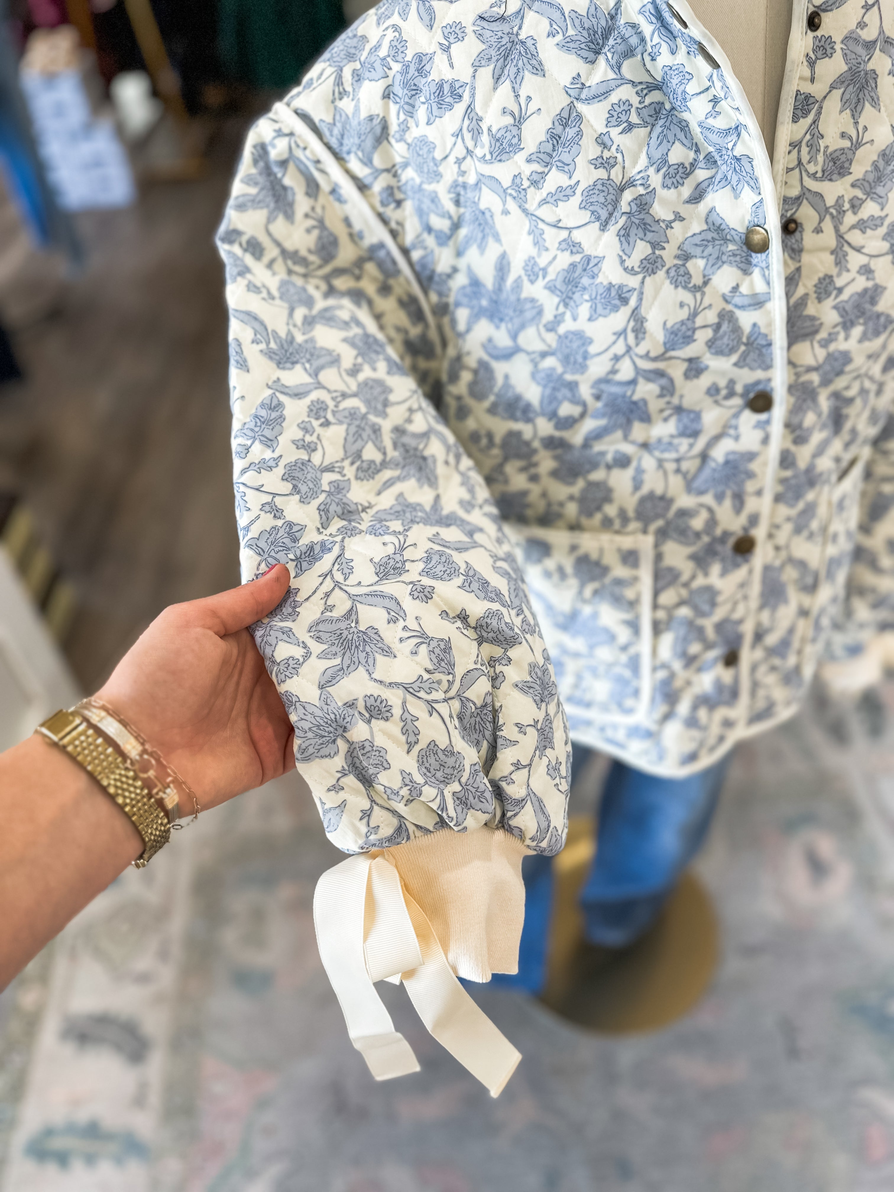 Featuring a soft quilted texture and a dainty blue floral print, it’s finished with contrast binding and tie-front details that make it extra special. Perfect for pairing with denim, dresses, or cozy knits.