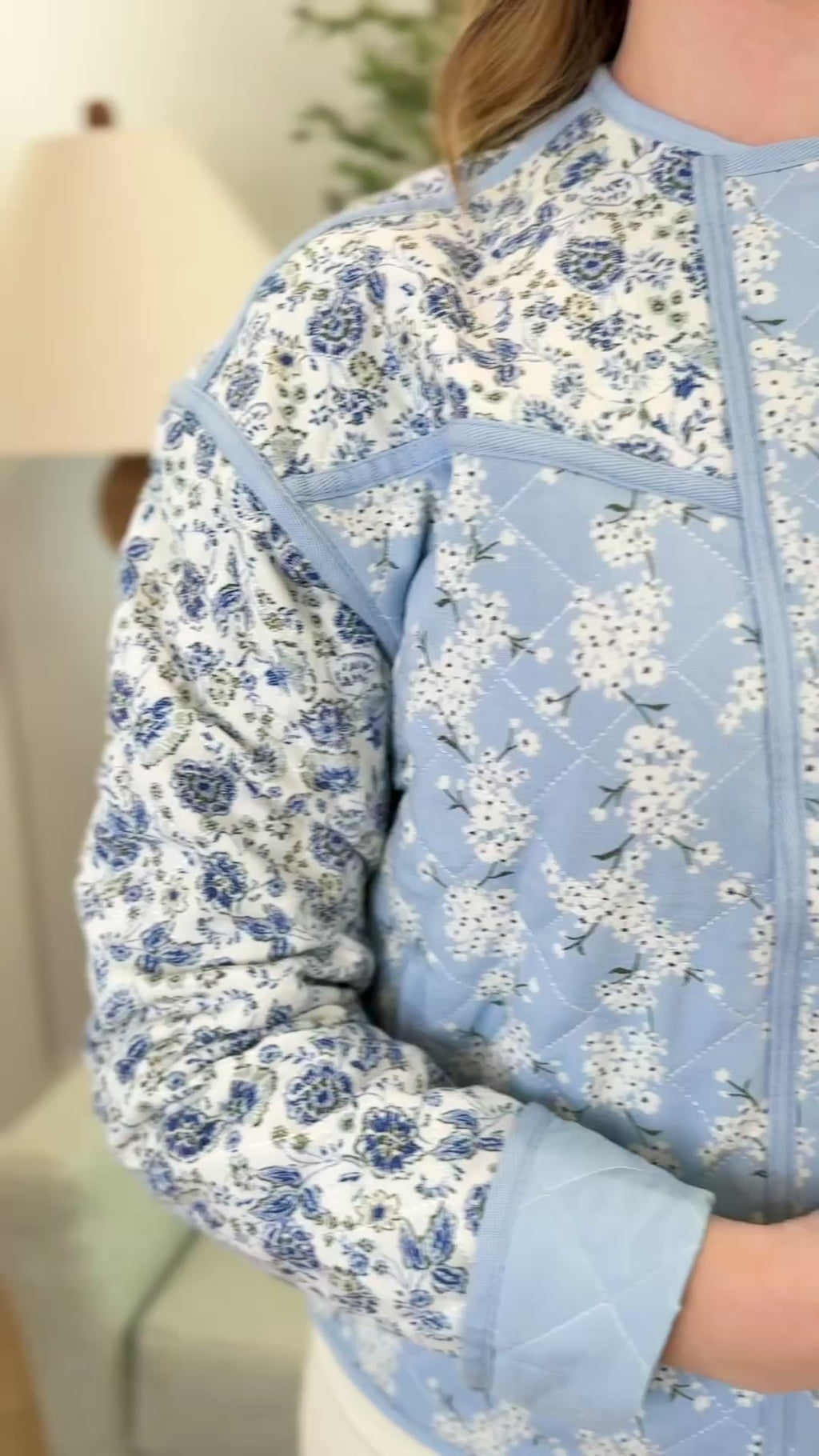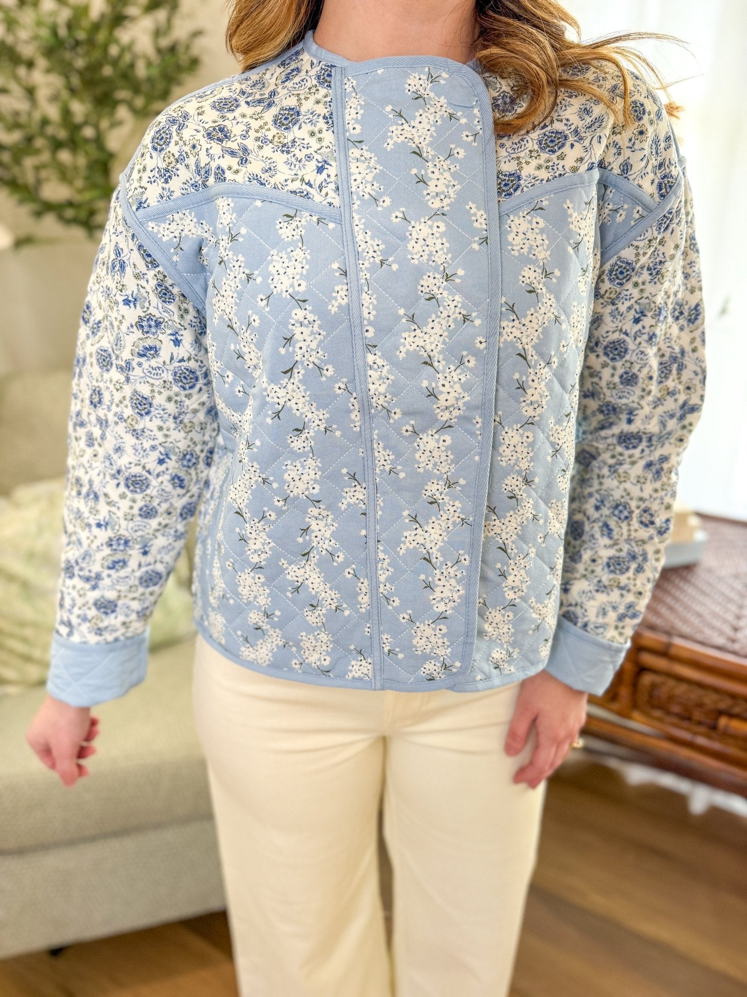 Design: Quilted construction with mixed vintage-inspired floral prints, rounded neckline, long sleeves, and a flattering relaxed fit.