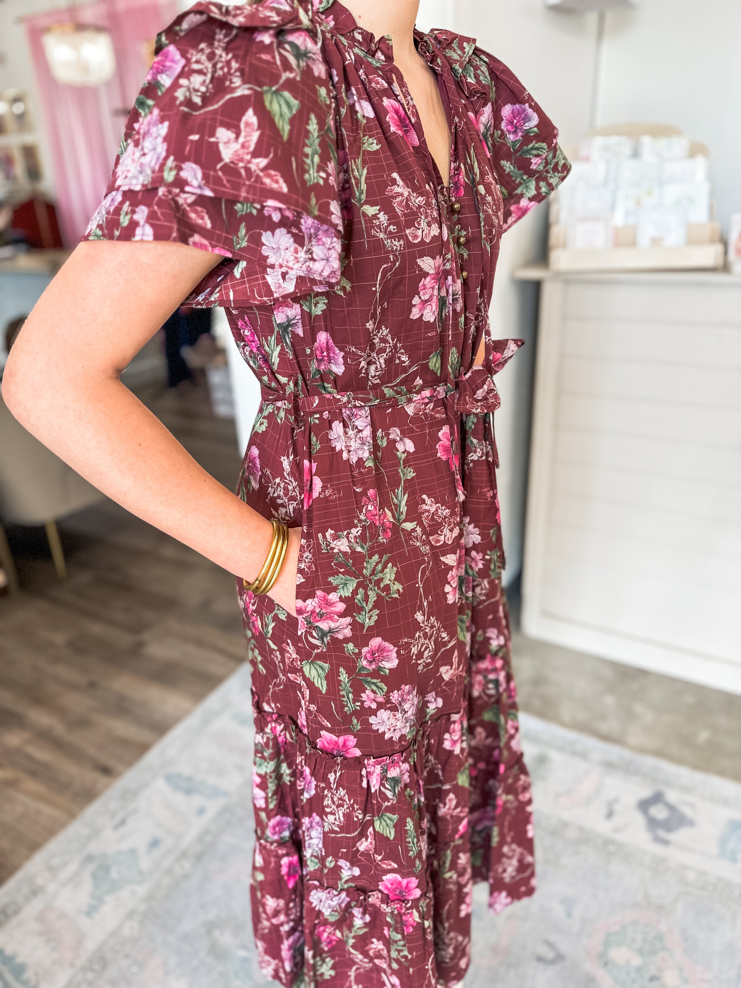Made for autumn outings, the Fall Fling Midi is your go-to for everything from pumpkin patch strolls to cozy dinners out. Its rich burgundy floral print and breezy silhouette bring seasonal charm, while the self-tie waist lets you adjust the fit for comfort and shape.