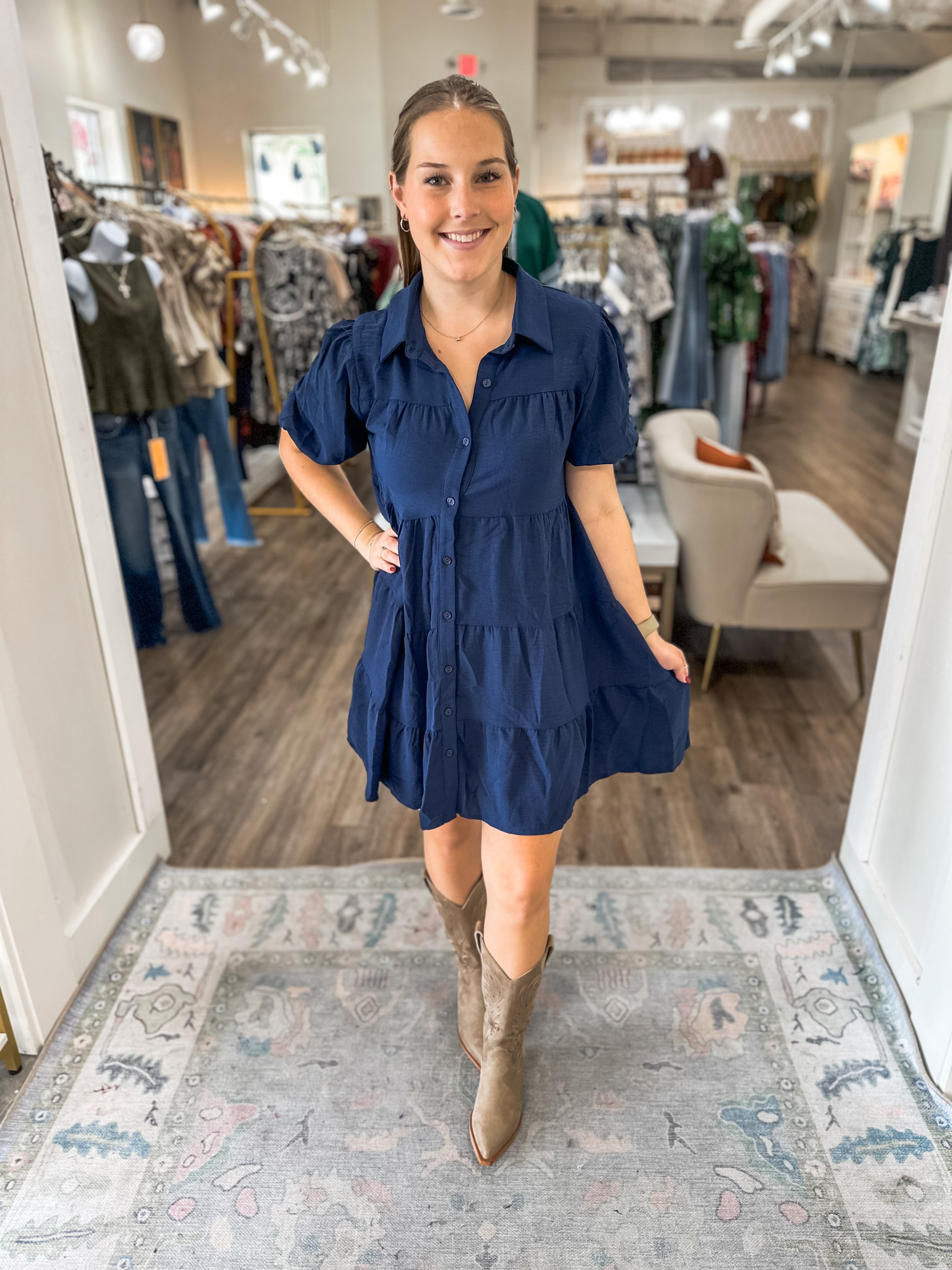 Easy, breezy, and endlessly versatile — this navy tiered dress is your go-to for weekday errands, casual dinners, or dressing up with boots and accessories for a polished look.